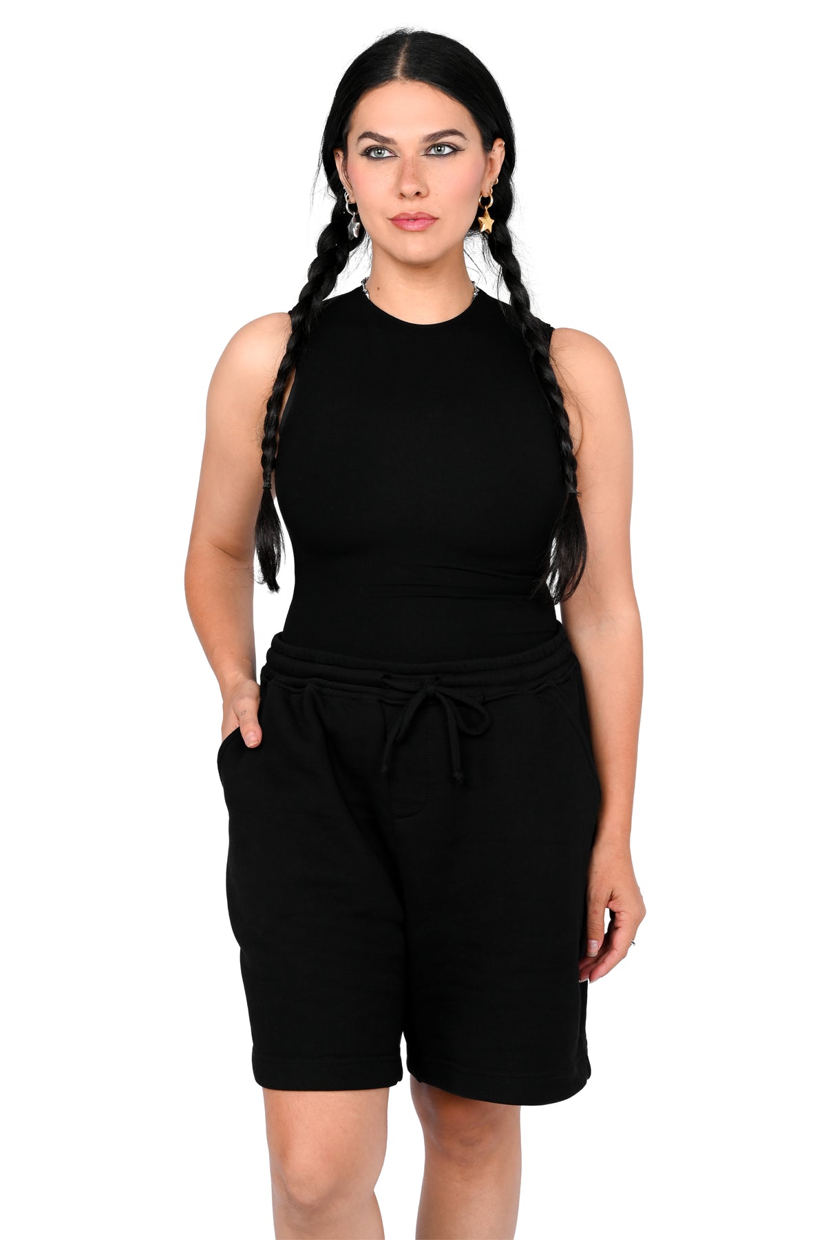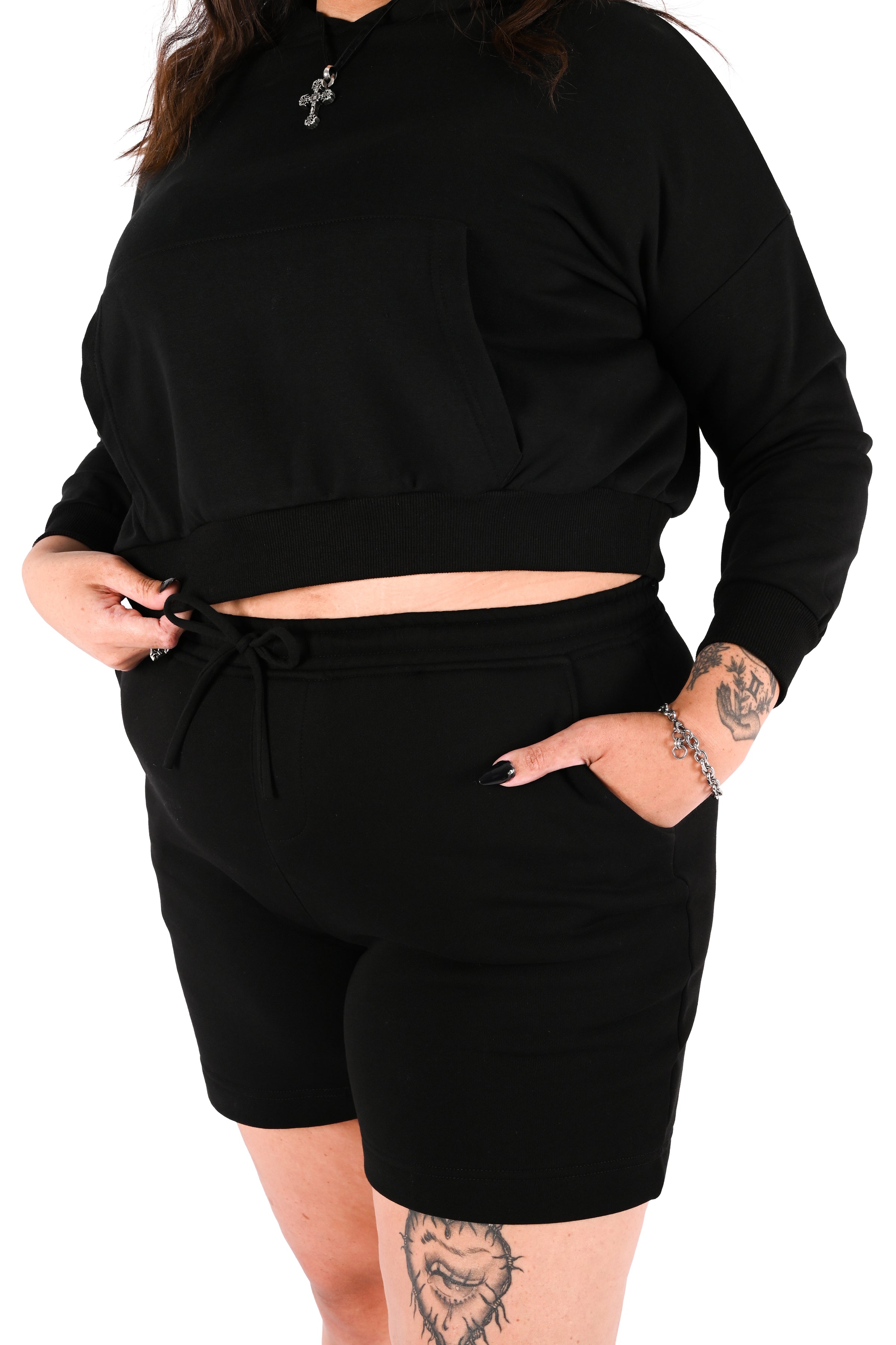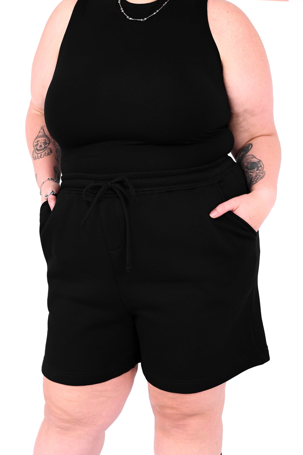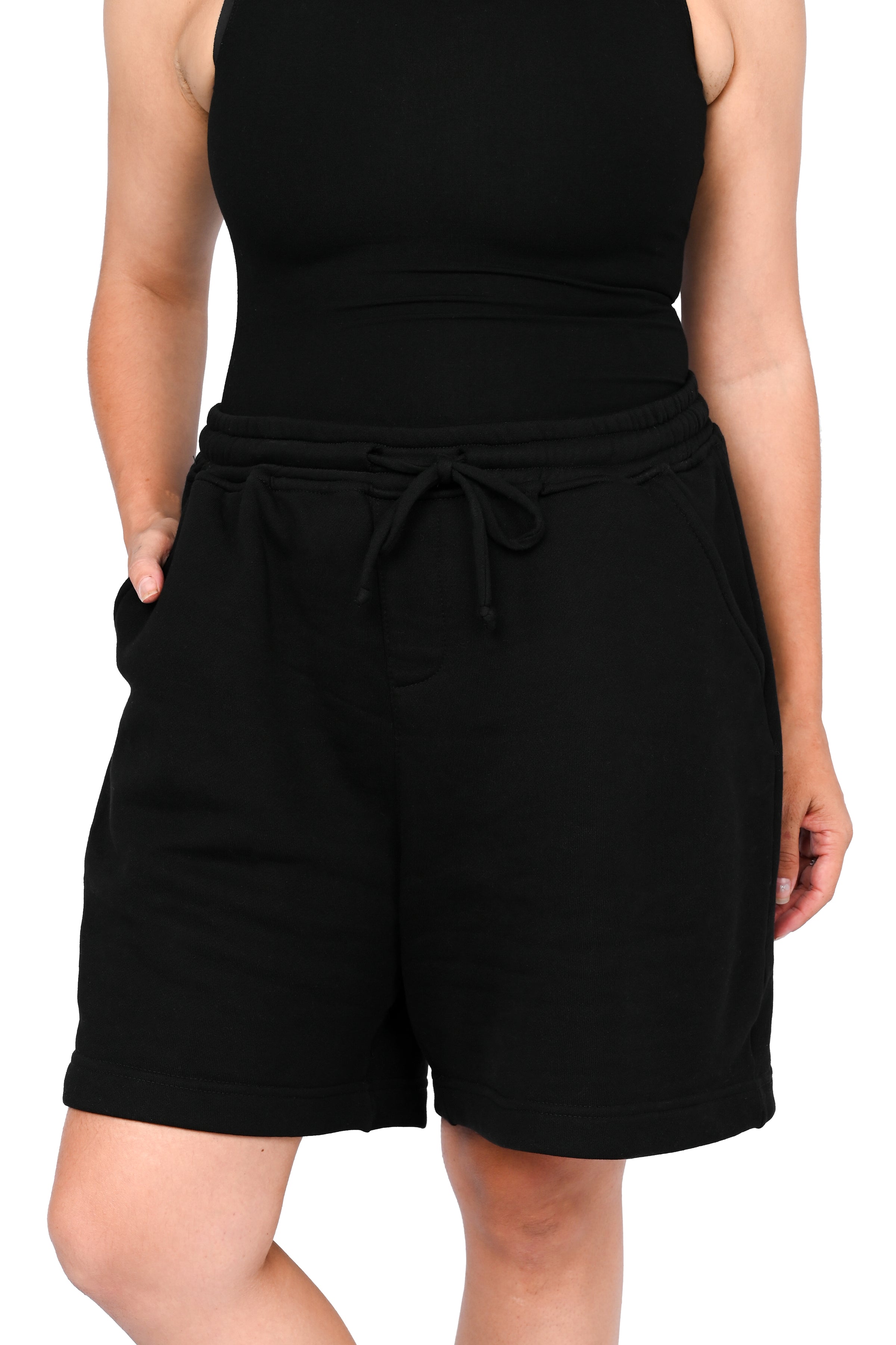 Elastic waistband with drawstring, two side pockets and one back pocket.