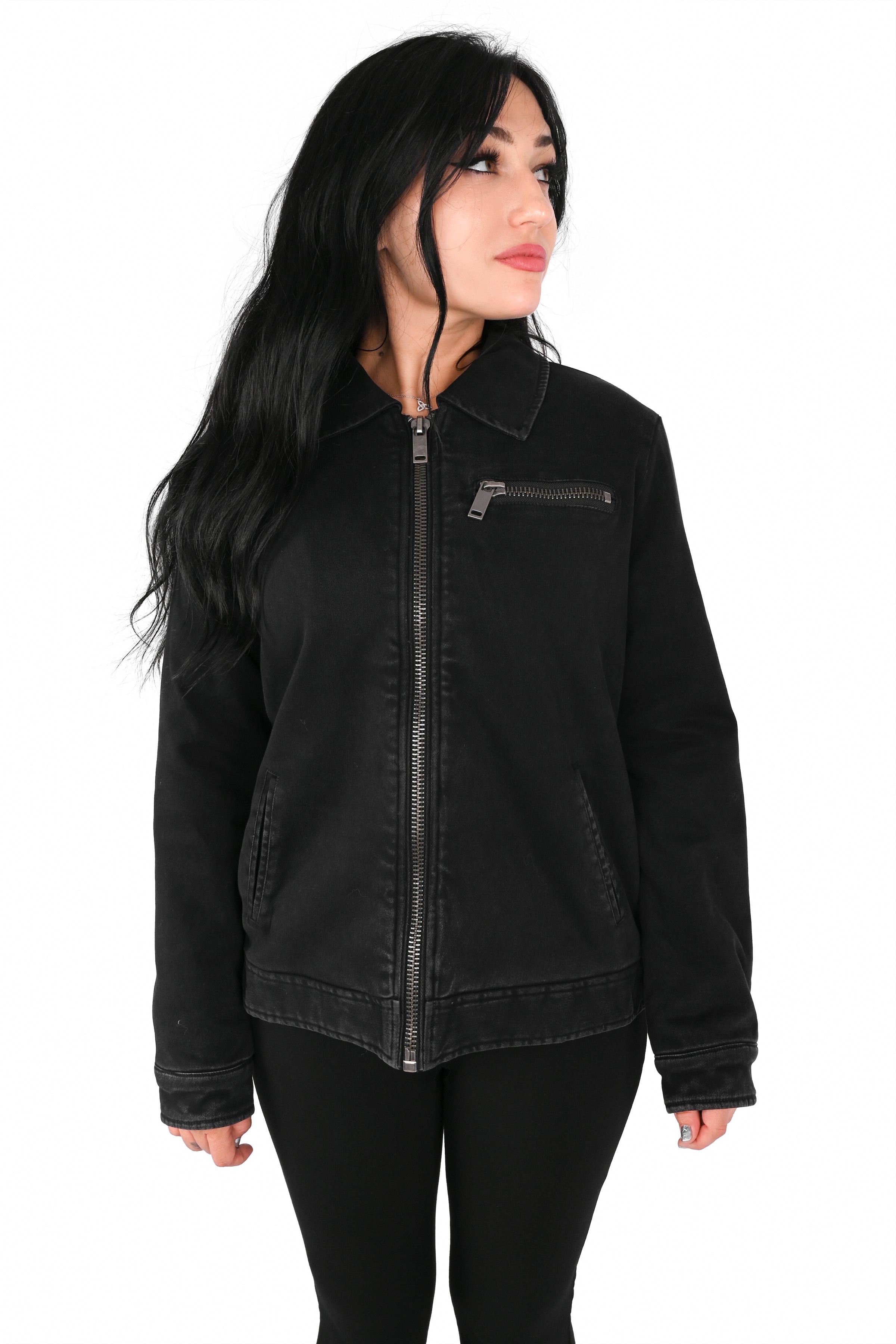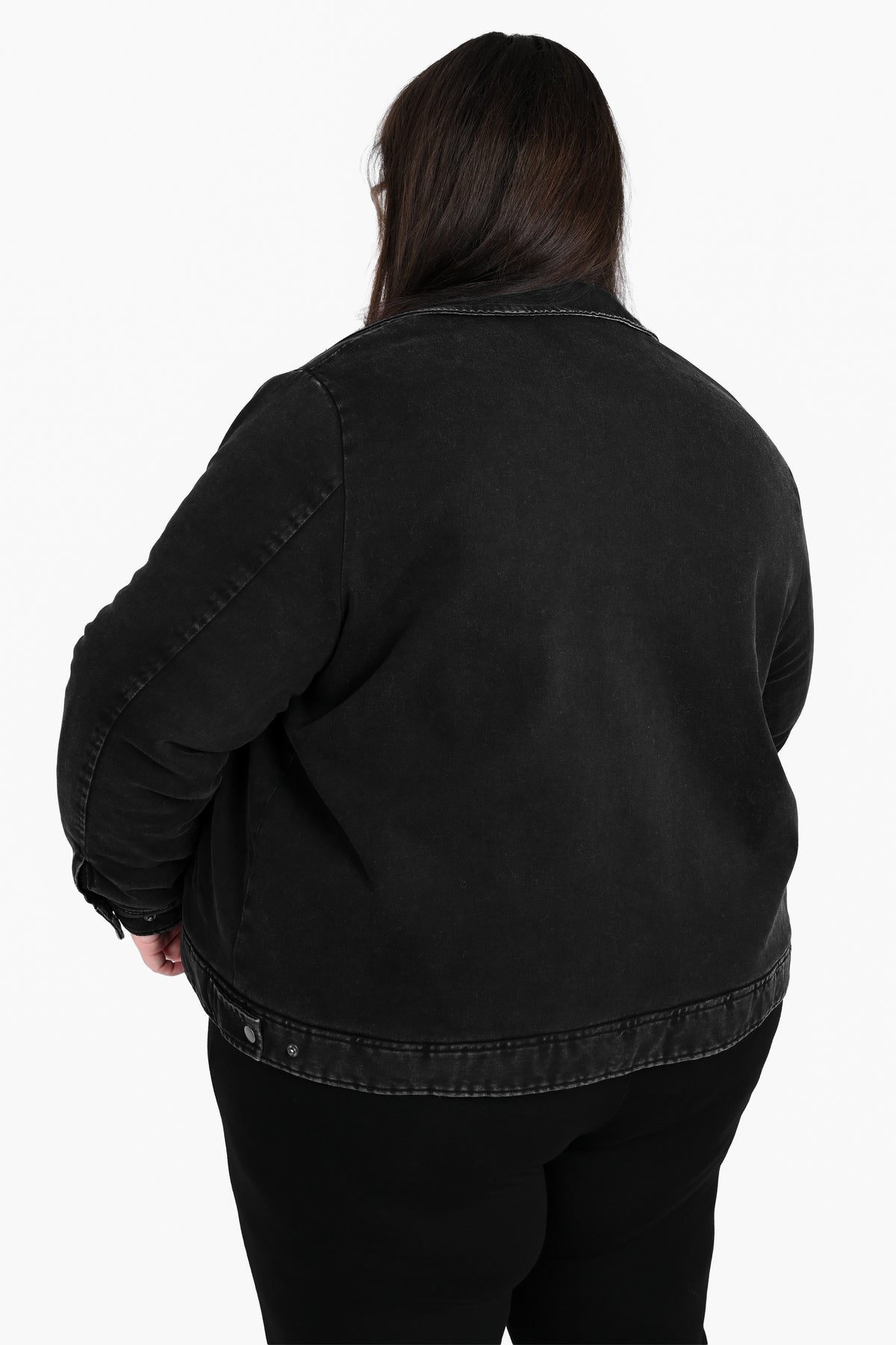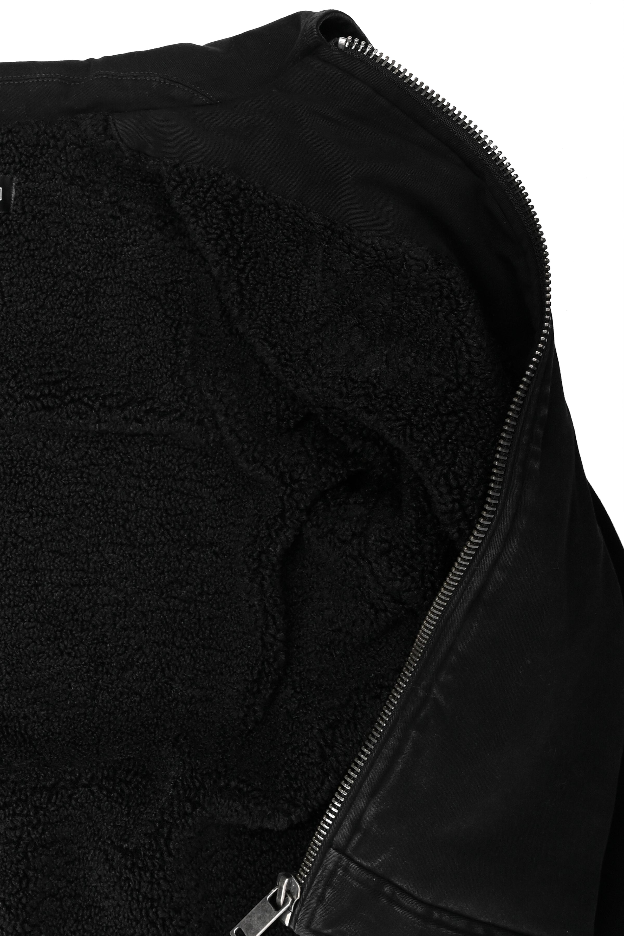 This work jacket is made out of a grey wash denim and lined in a super soft faux sherpa lining.