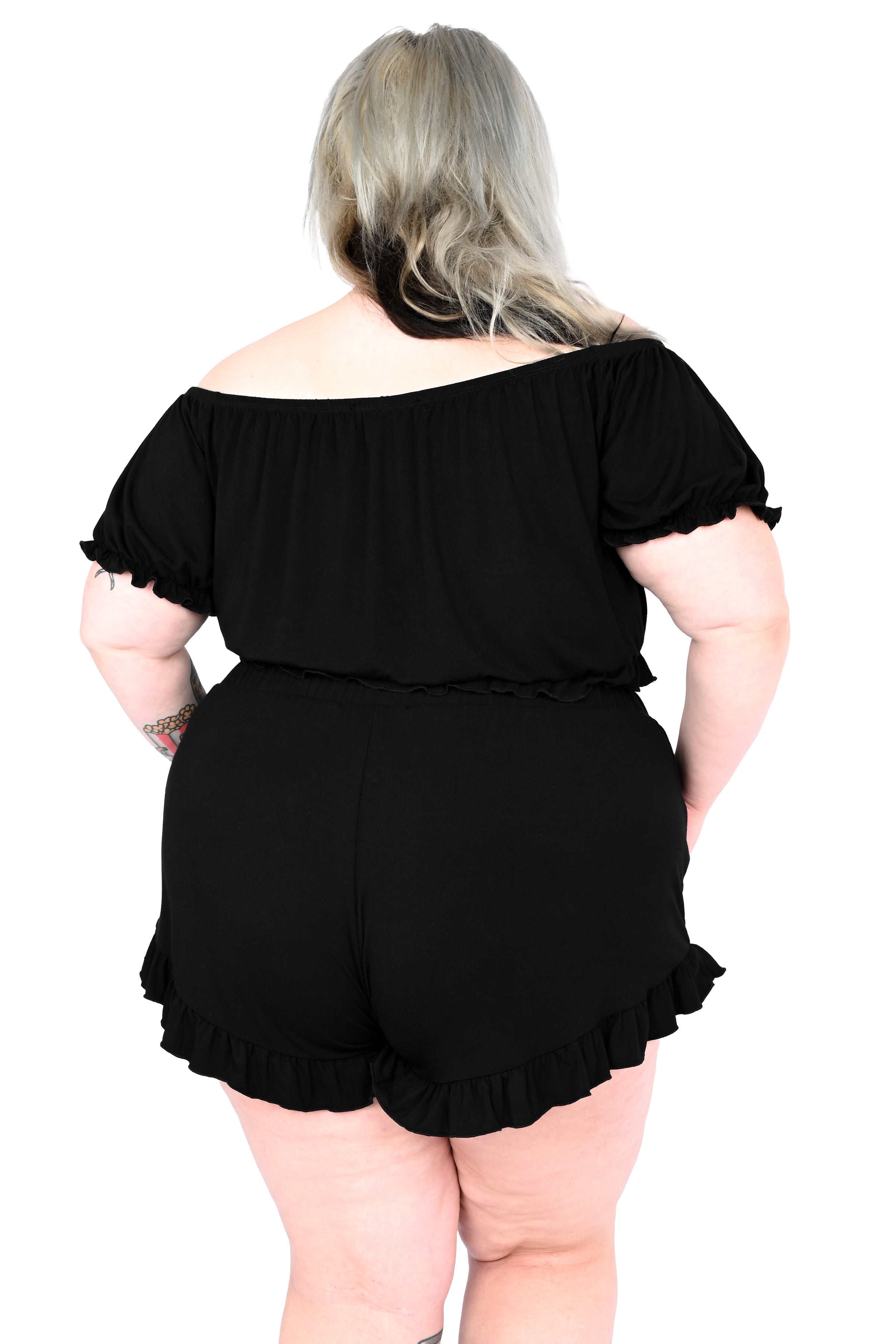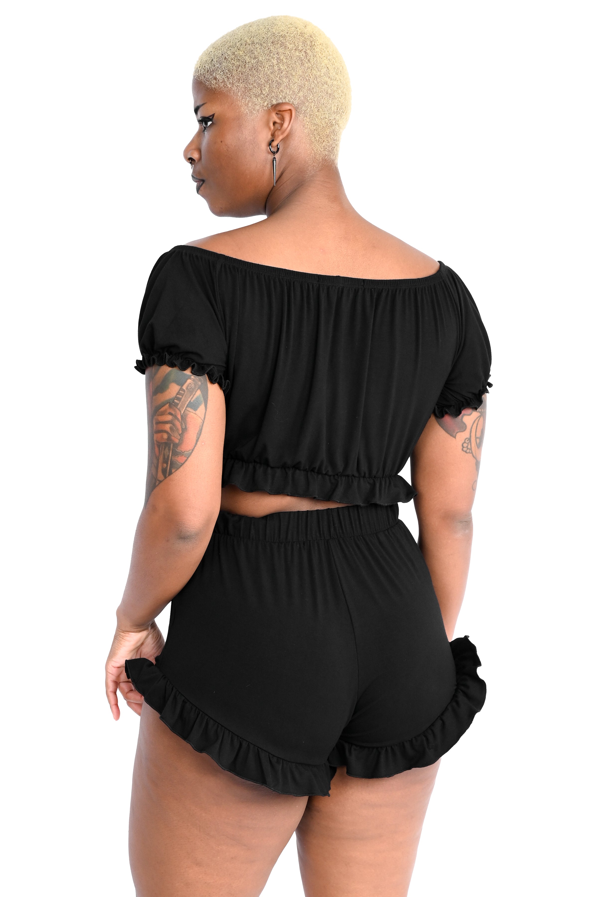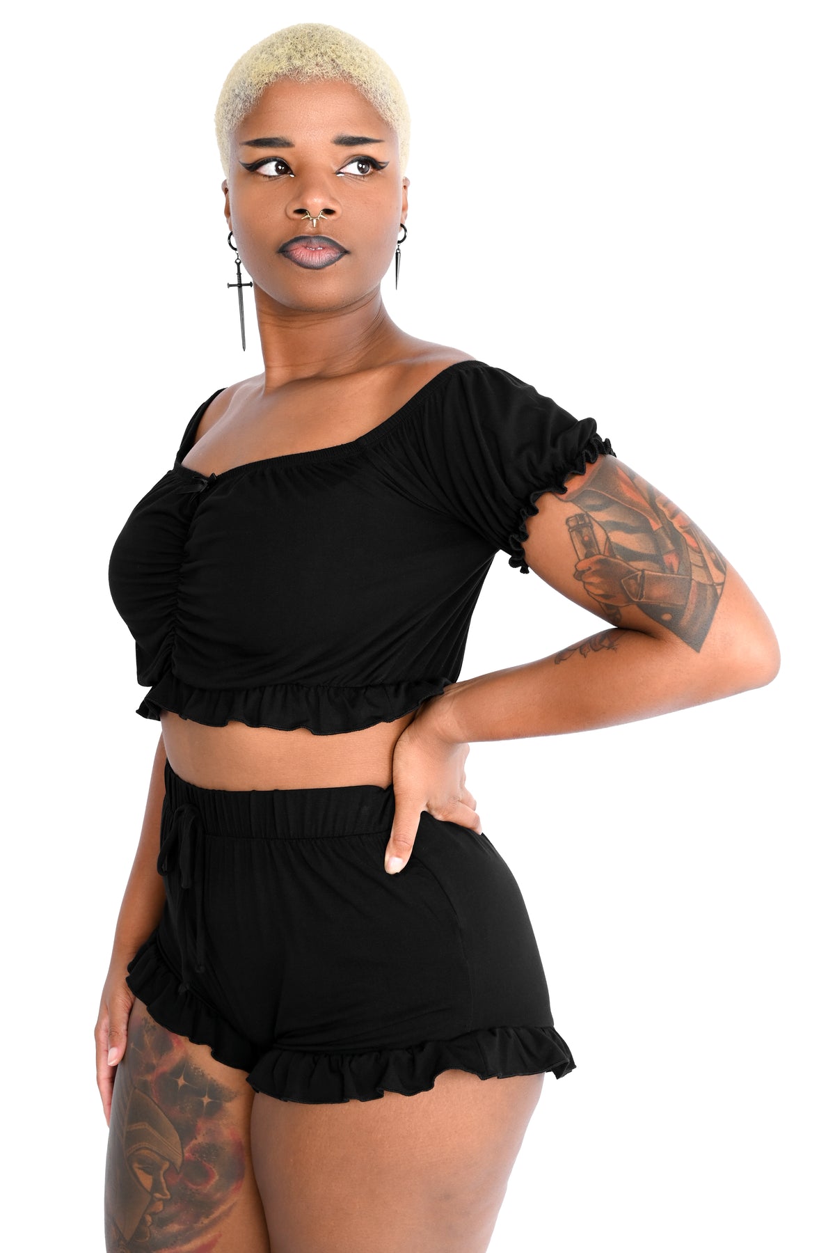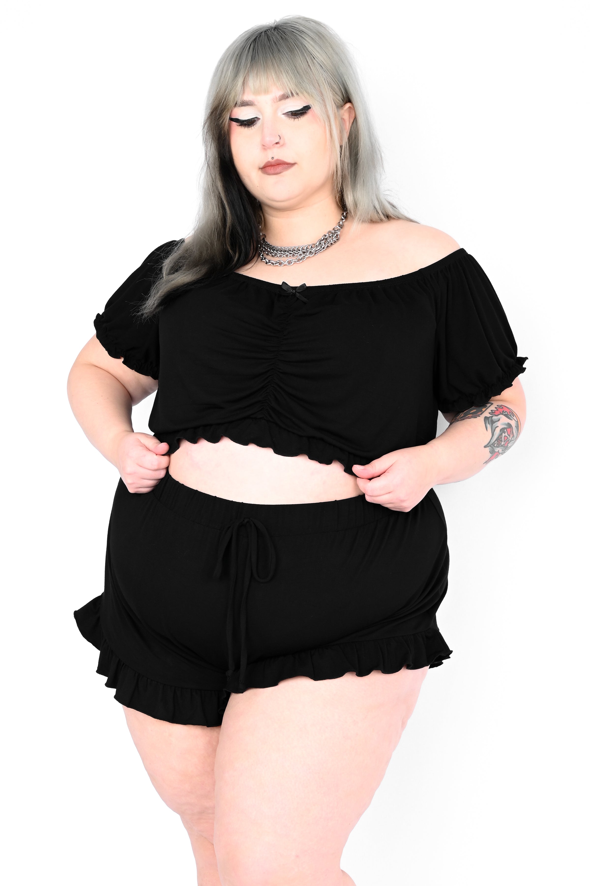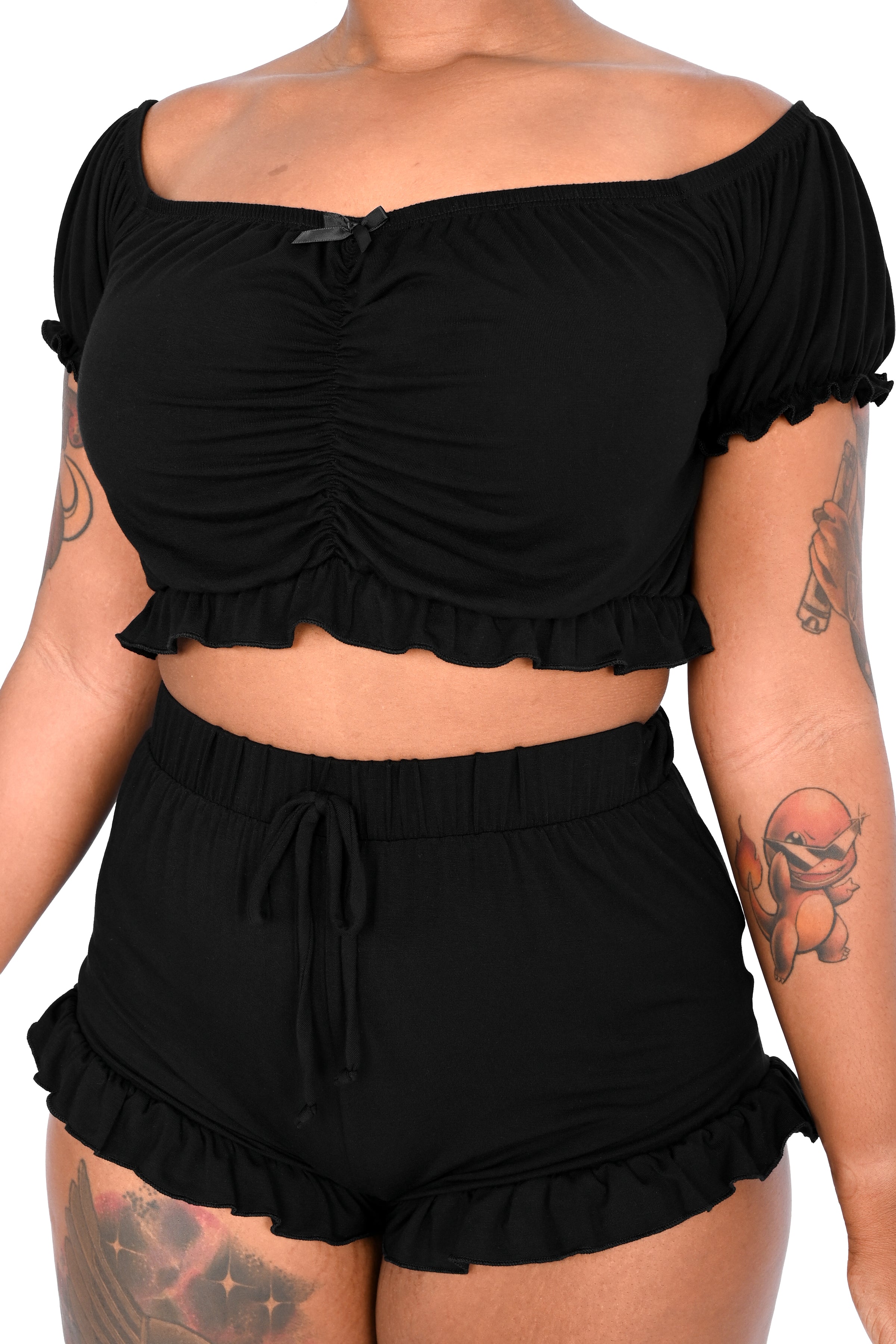 Top is ruched on the bust with comfortable elastic on the bottom hem, neckline and sleeves. Plus a little bow detail in the middle.