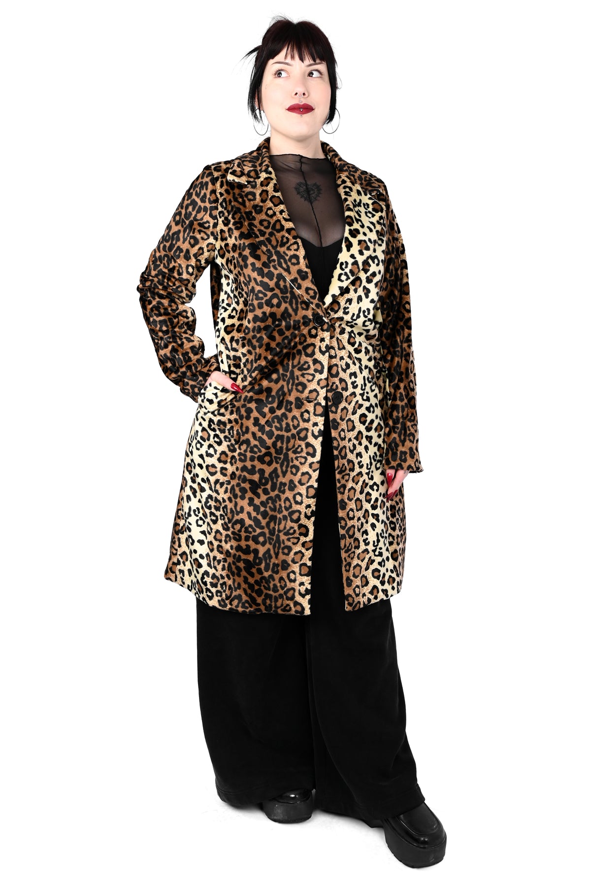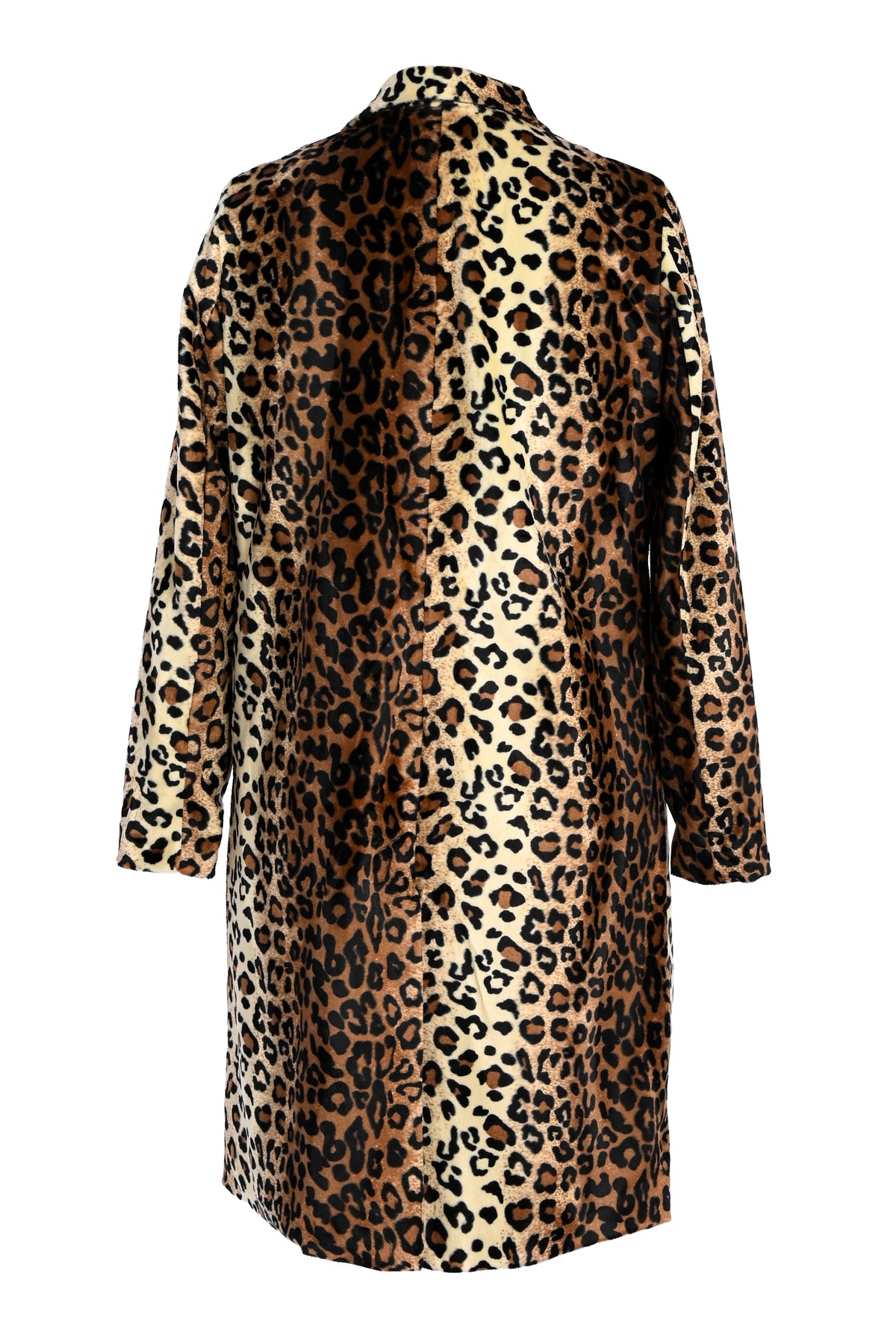 A velvet leopard print trench coat with front button closure, pockets and black satin lining.
