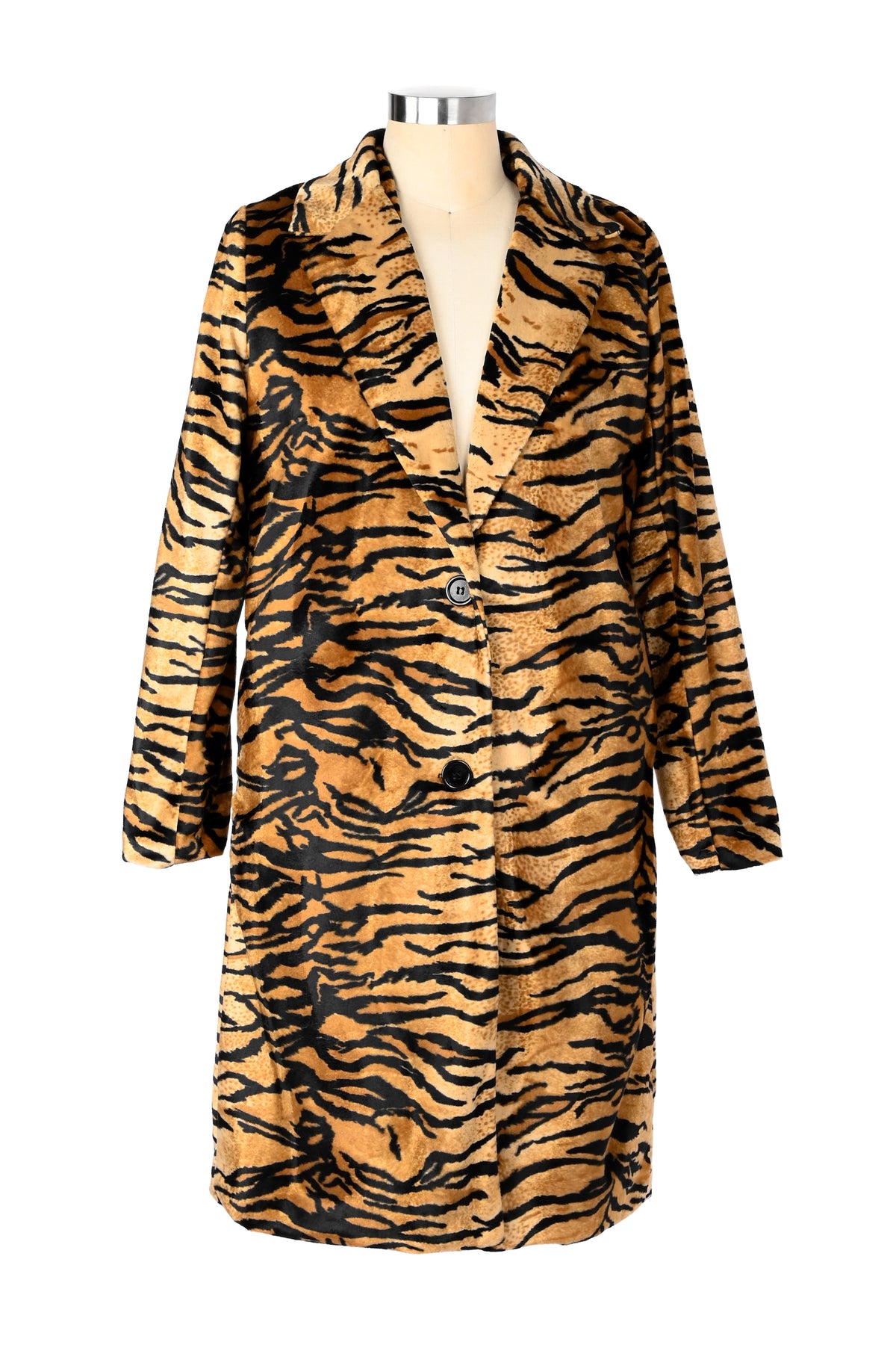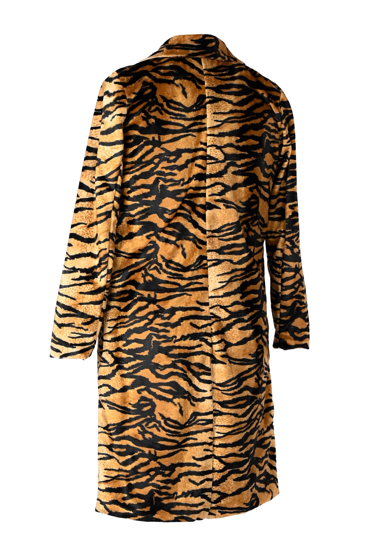 A velvet tiger print trench coat with front button closure, pockets and black satin lining.