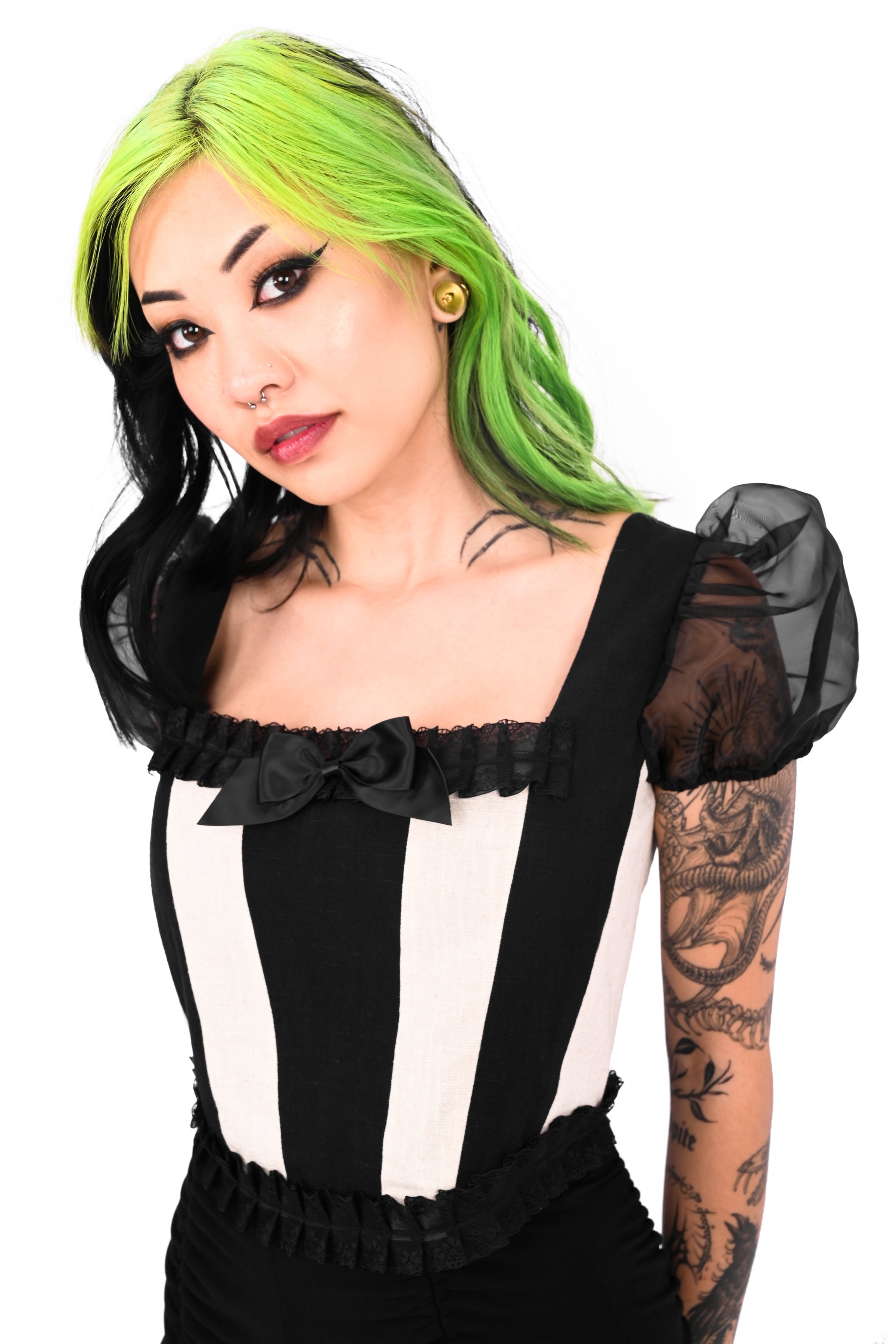 Black and off-white striped corset with organza puff sleeves, lace ruffling on the neckline and bottom hem, and a little satin bow in the middle of the neckline.
