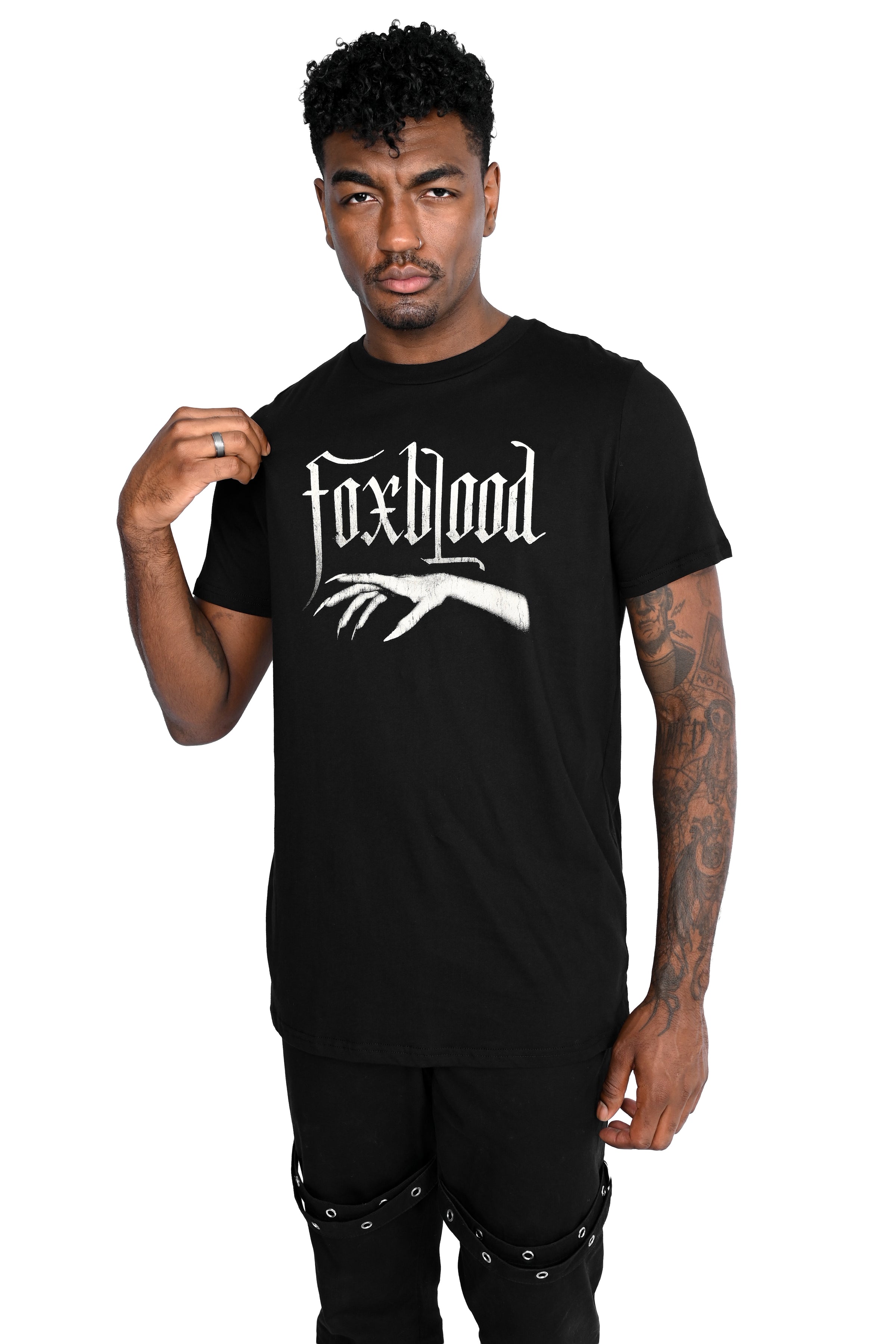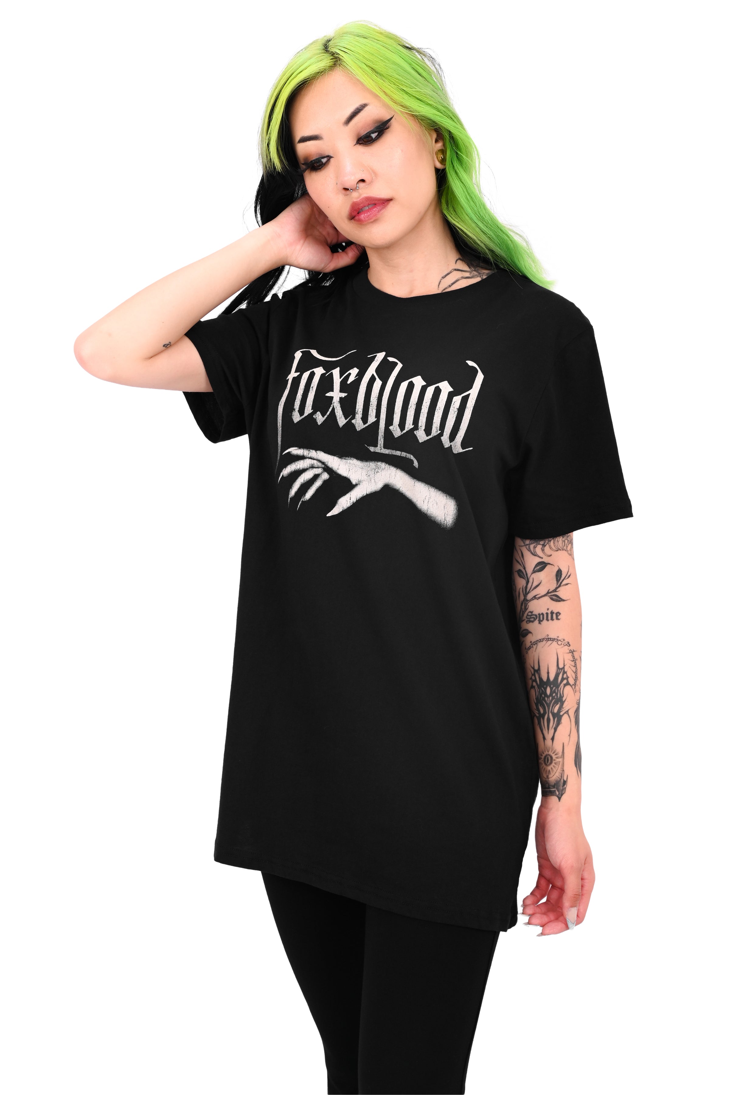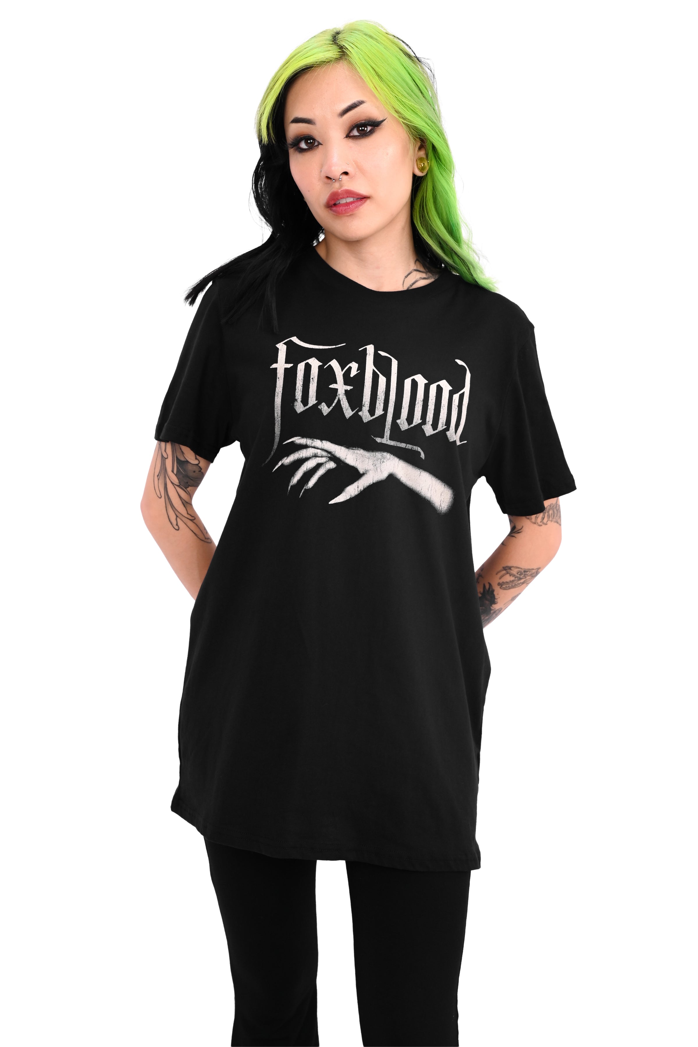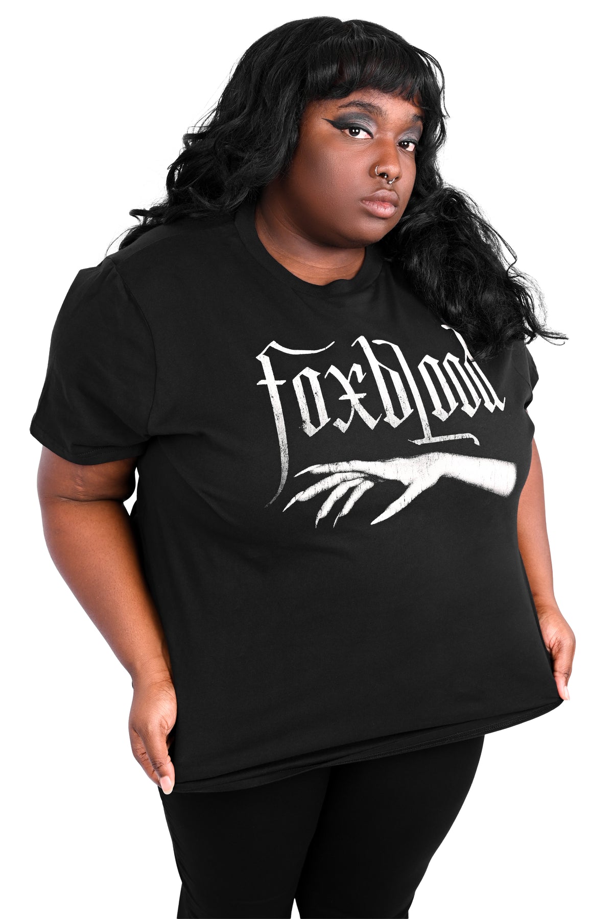 Oversized black tee featuring our Shadow Hunter design and Foxblood logo in a vintage white. All real art made by us, no AI here. The logo was hand drawn and then hand is a photo of one of ours!