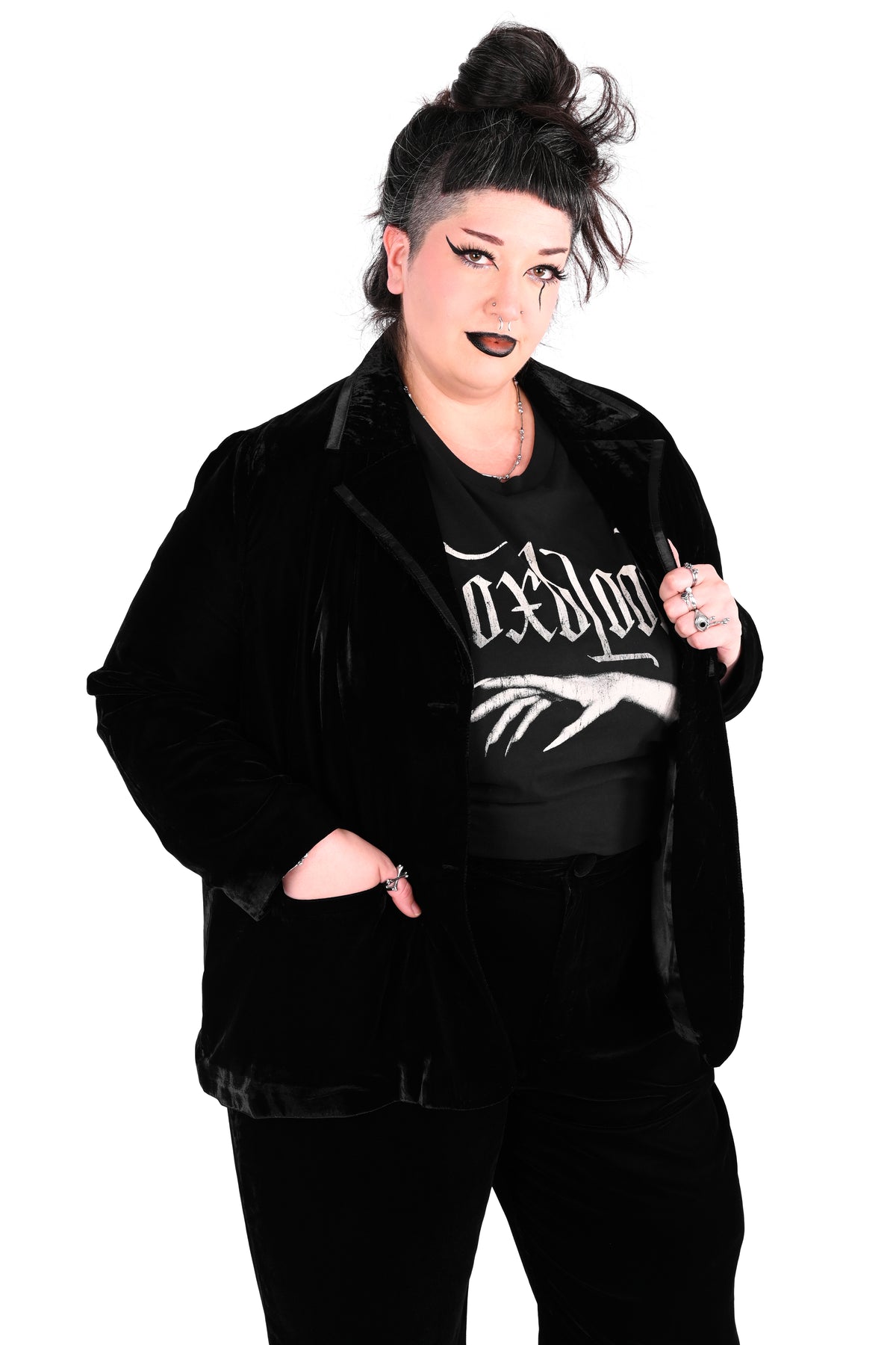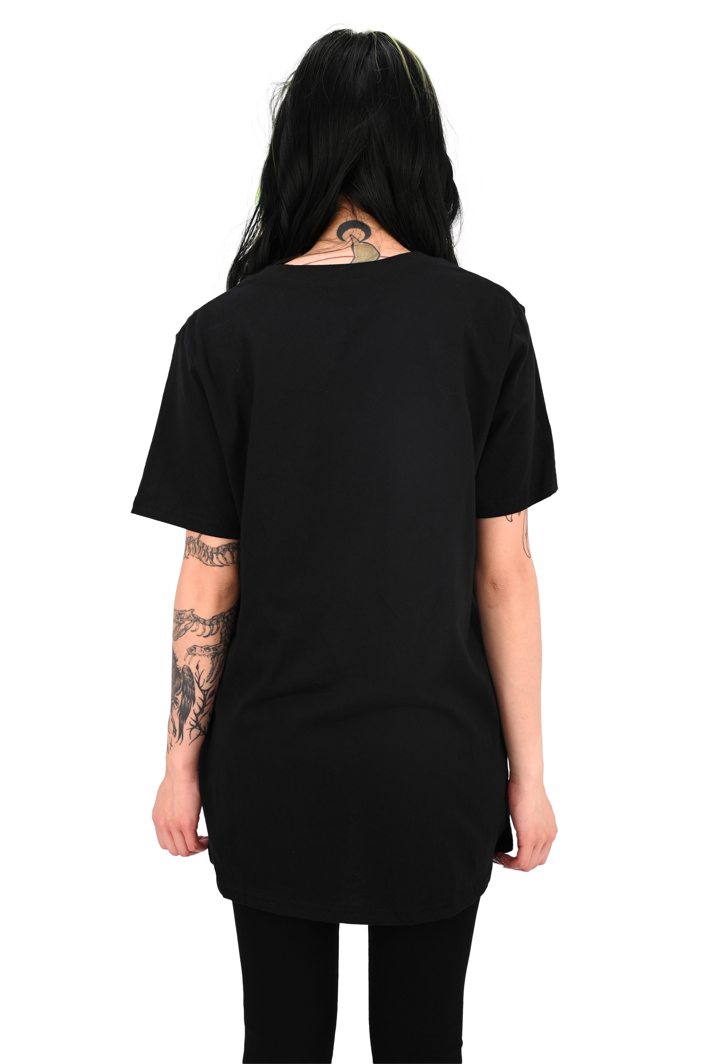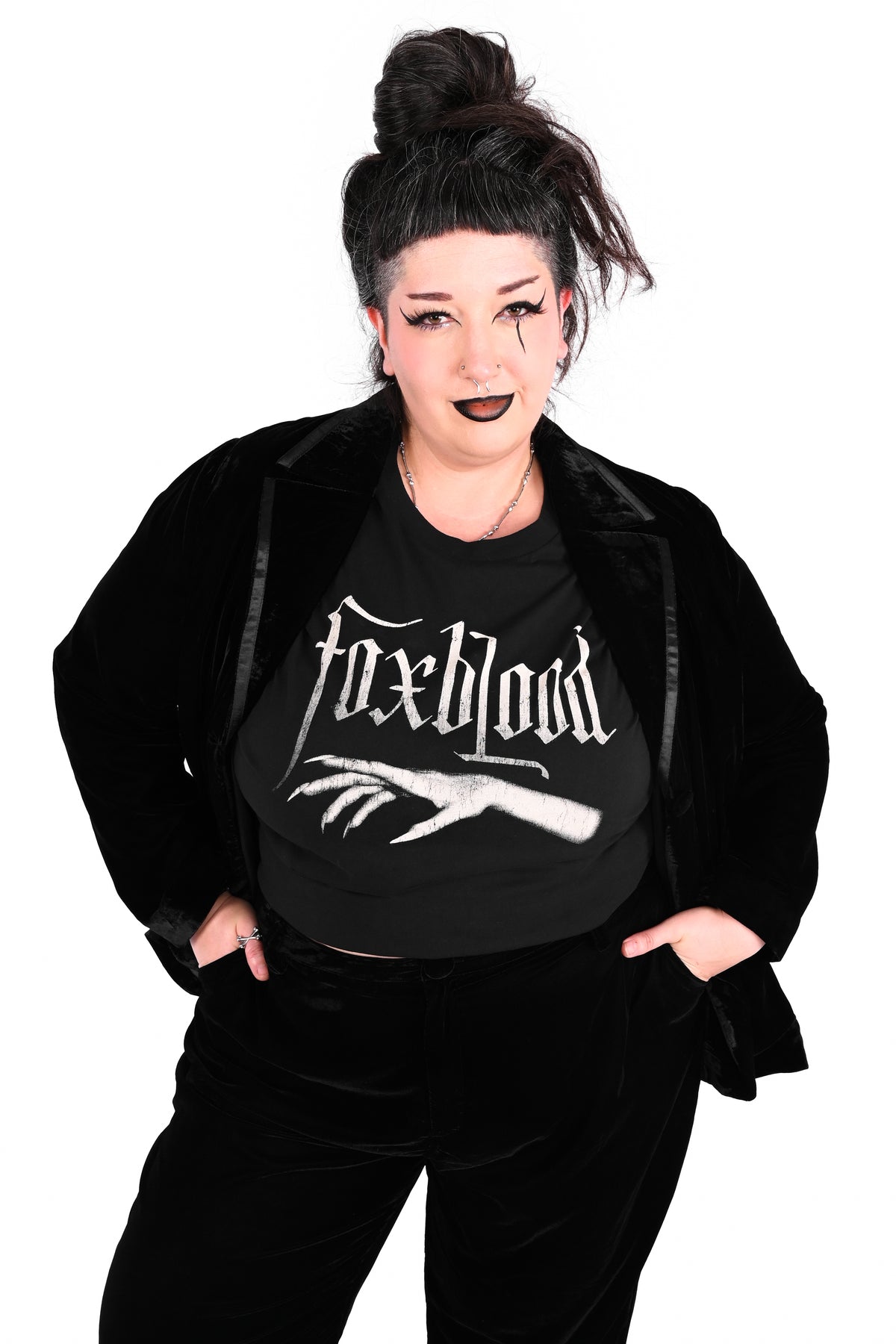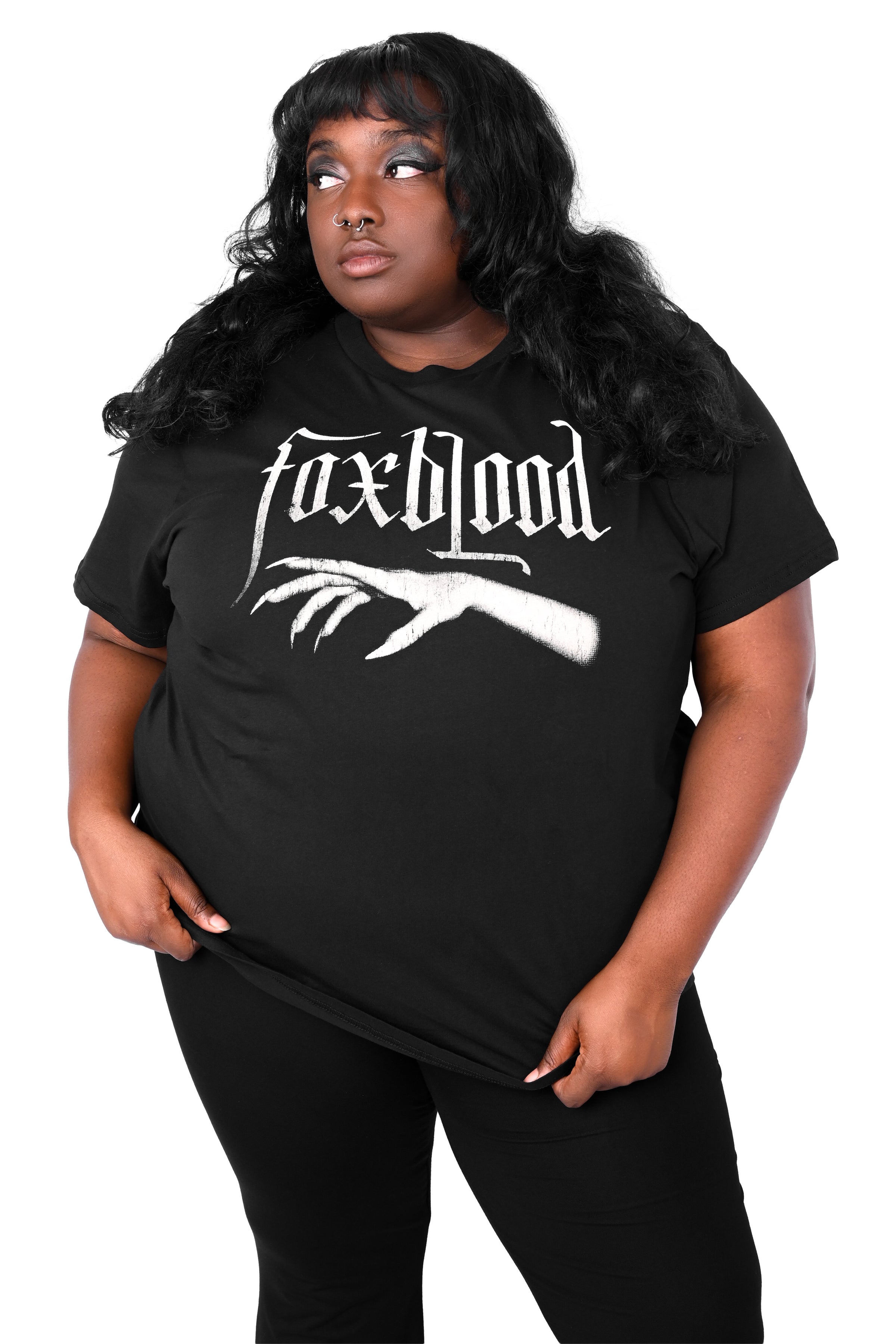 Oversized black tee featuring our Shadow Hunter design and Foxblood logo in a vintage white. All real art made by us, no AI here. The logo was hand drawn and then hand is a photo of one of ours!