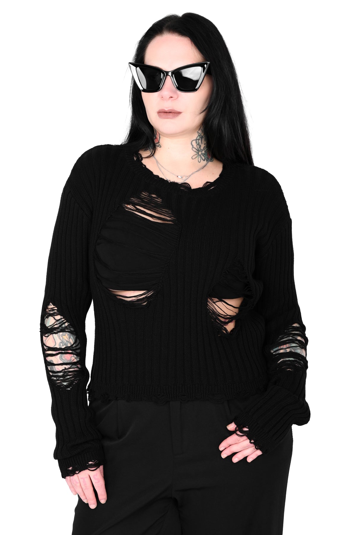 The front is shredded on one side, you can layer this piece with a cute bra, tank top, or a tee.