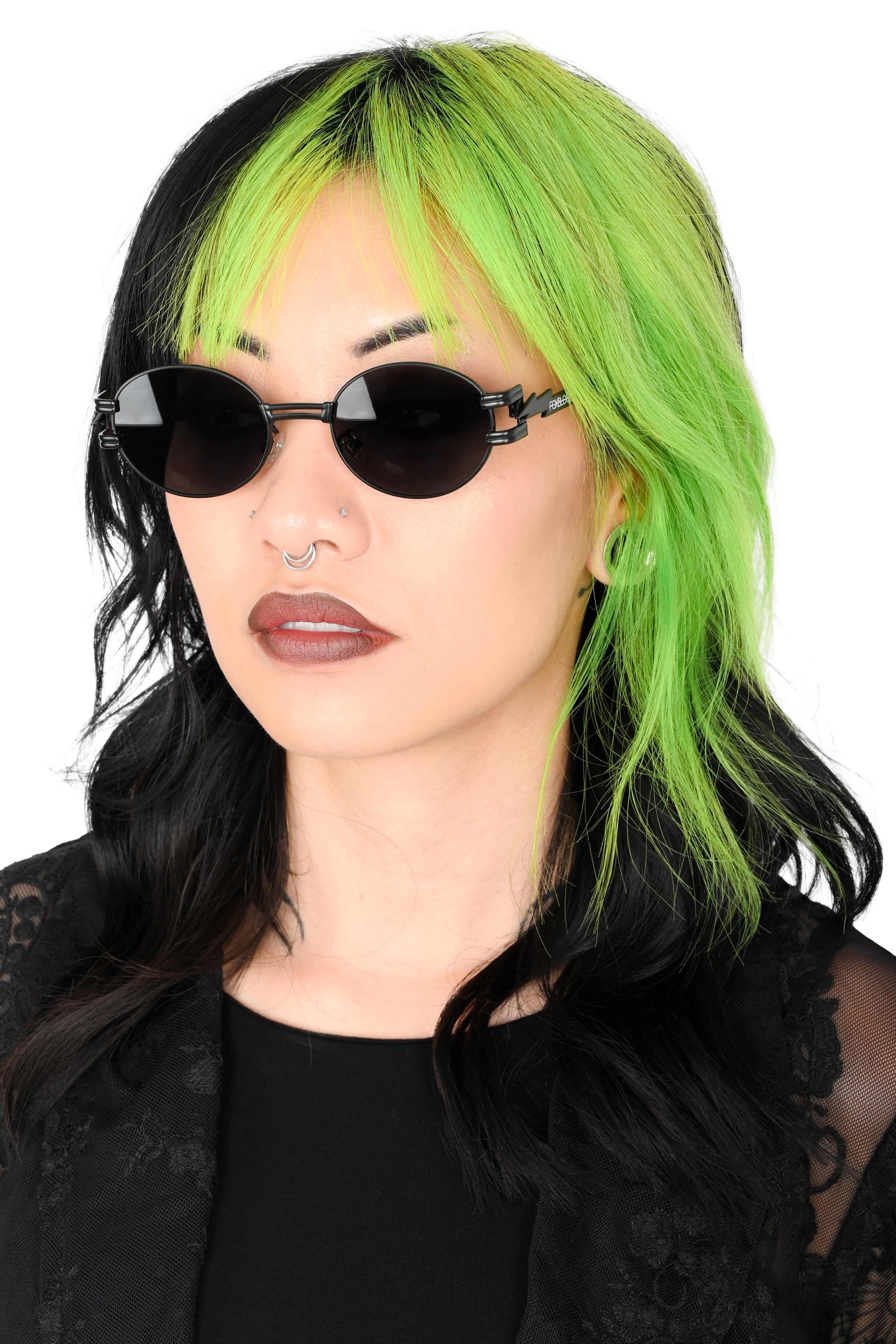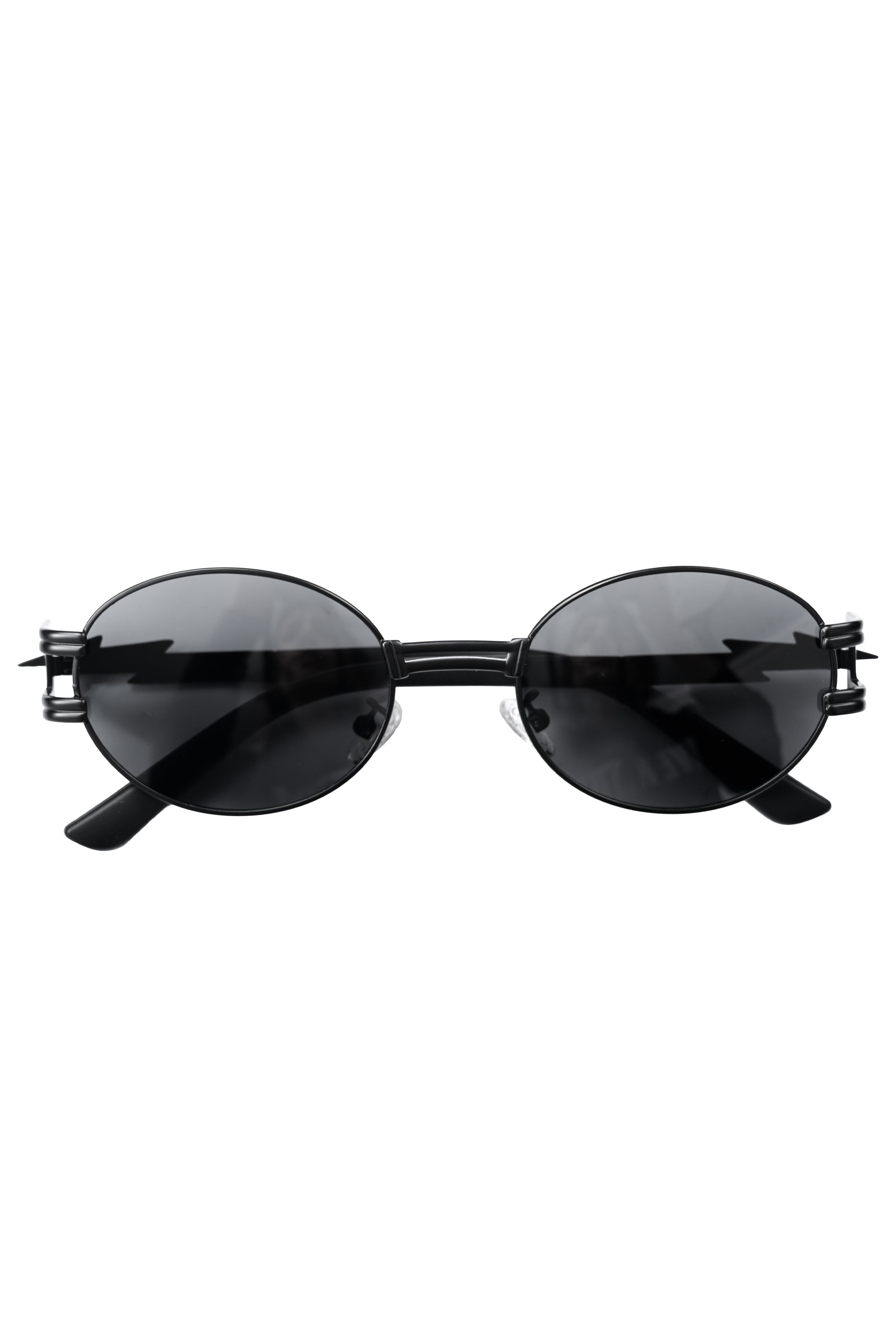 Smaller, round metal frame sunglasses with lightning bolt detail on the black metal arm. Foxblood logo on the left arm. Black colored lenses.