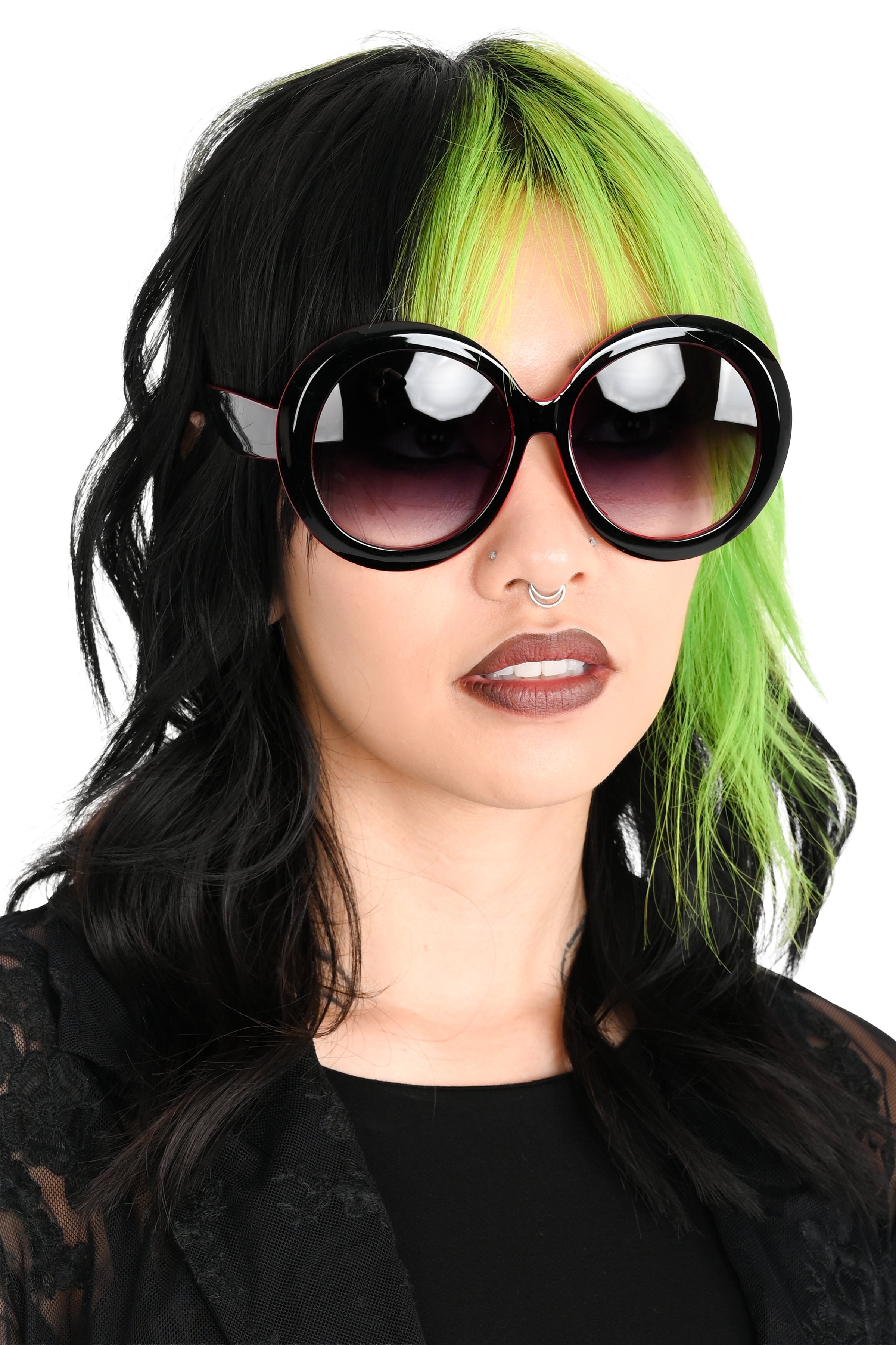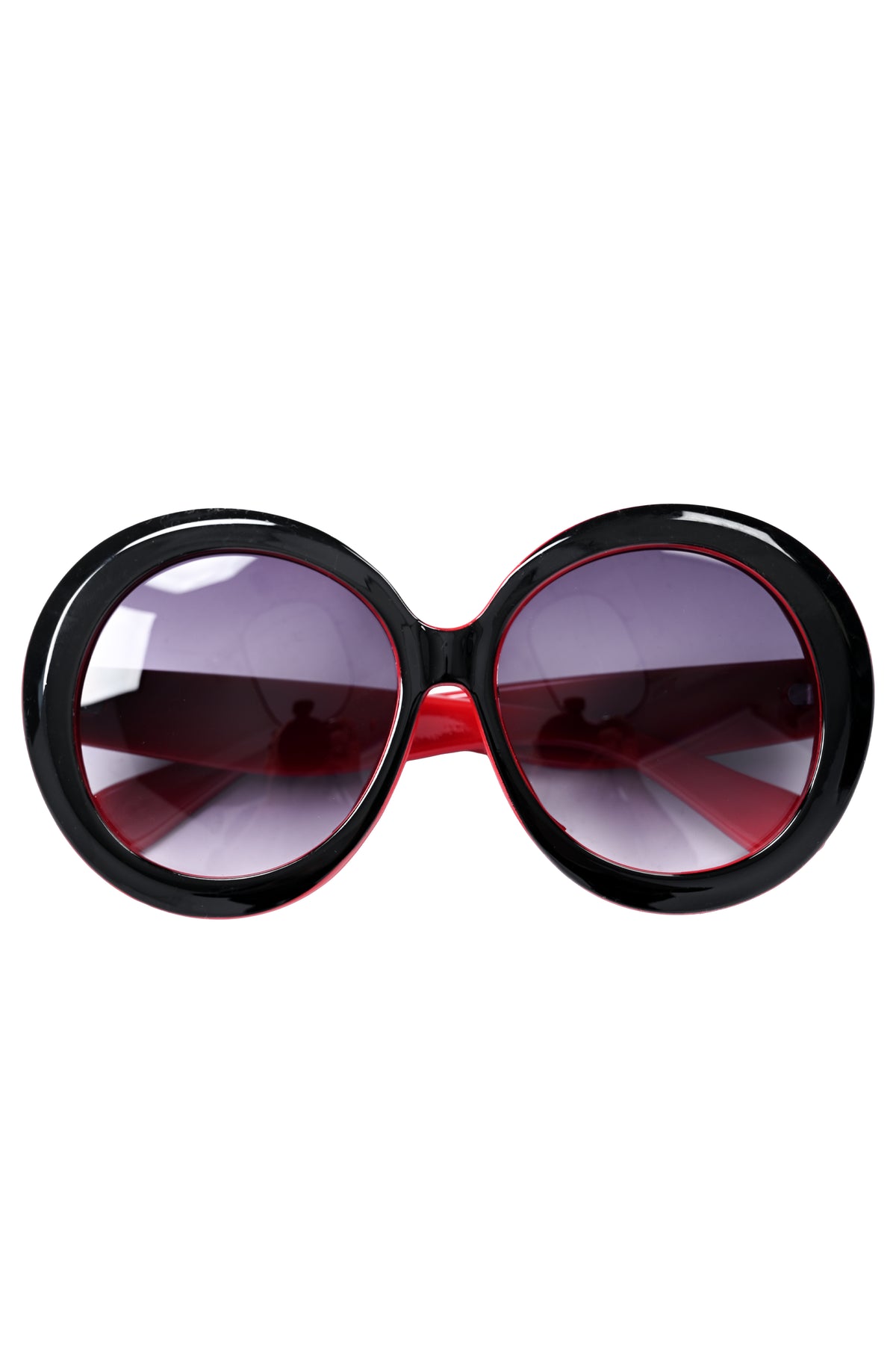 Oversized round frames with tinted lens and a pop of red on the inside rim. FOXBLOOD logo on the left arm