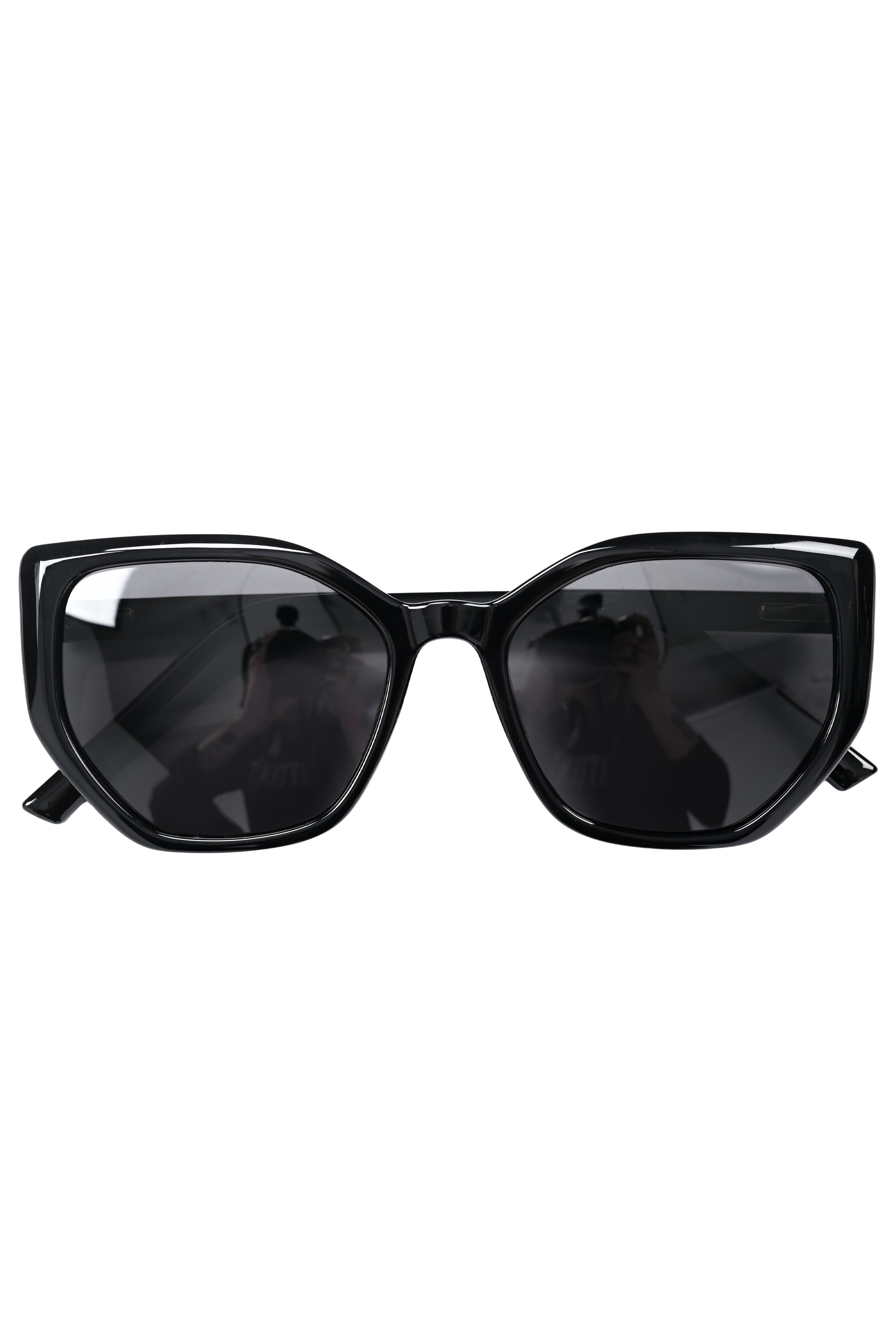 Oversized black cateye sunglasses with black on black Foxblood logo on the left arm