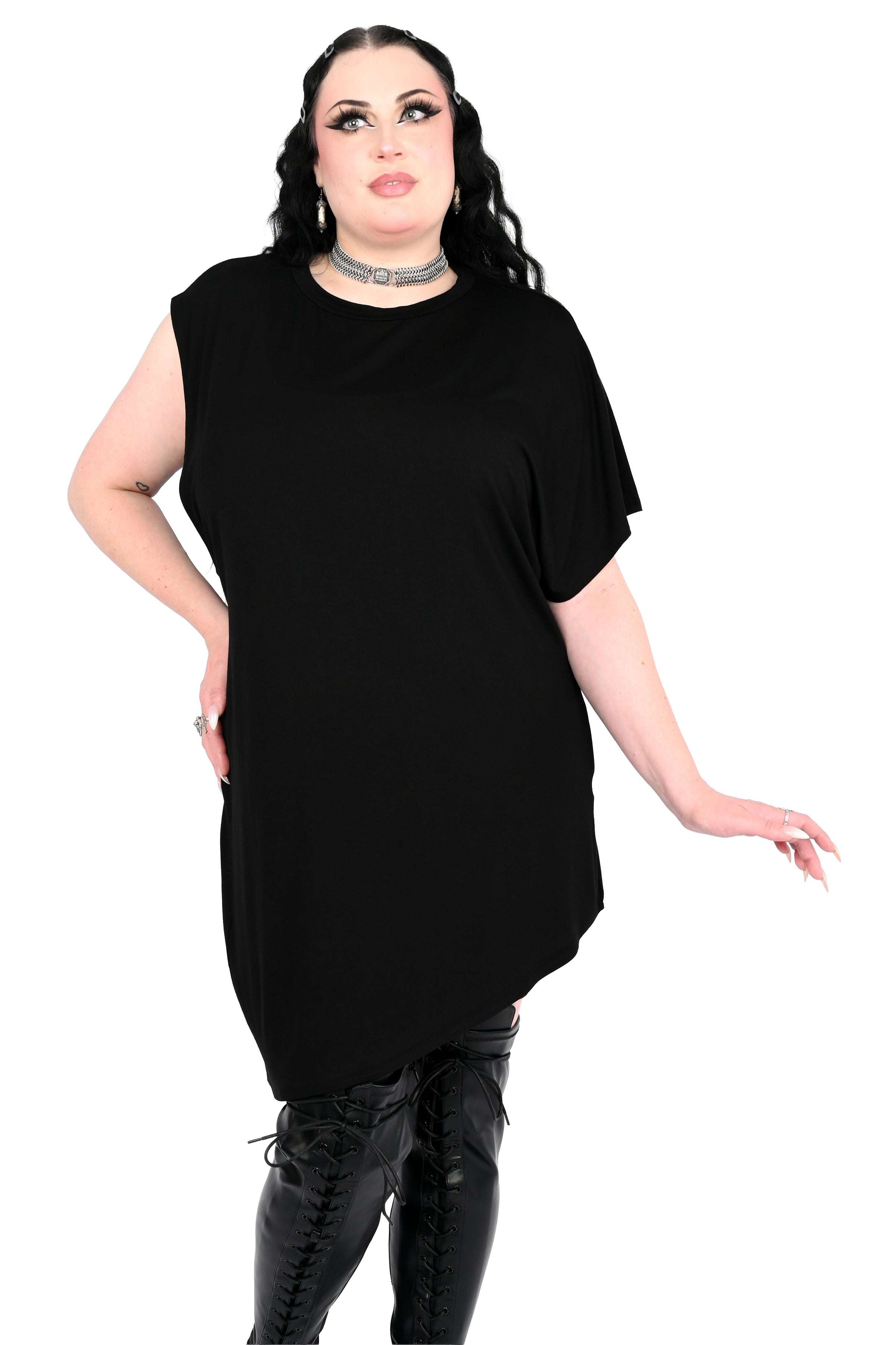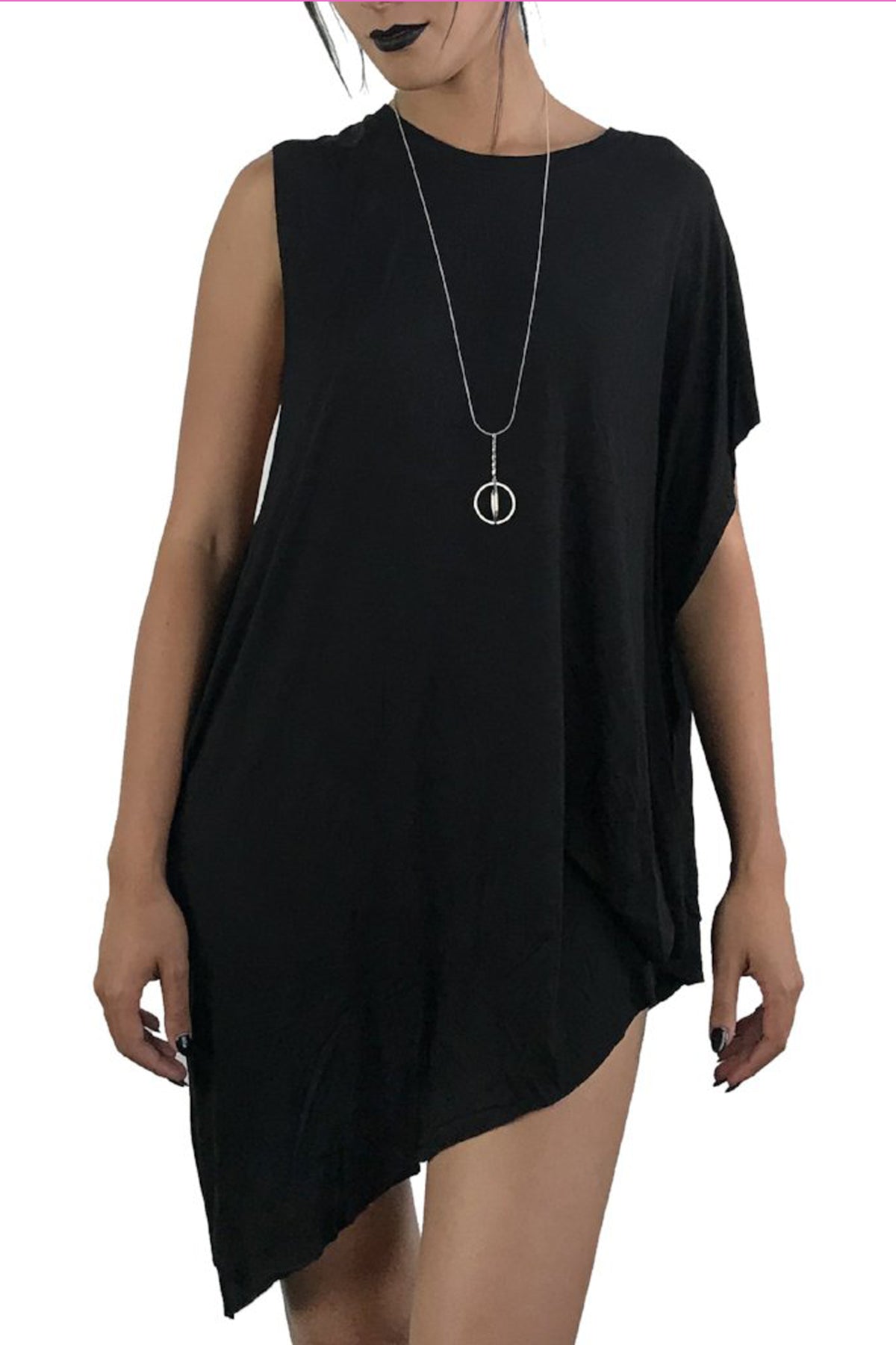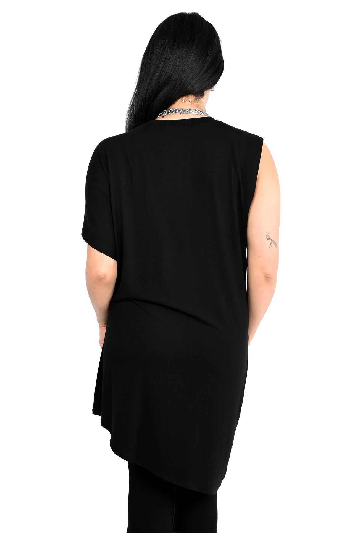 This top is oversized and long. One side is sleeveless and the other has a dolman style sleeve