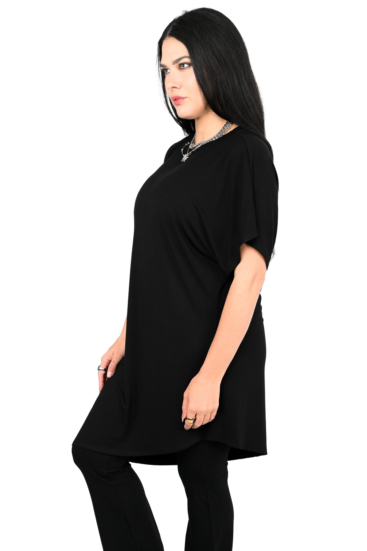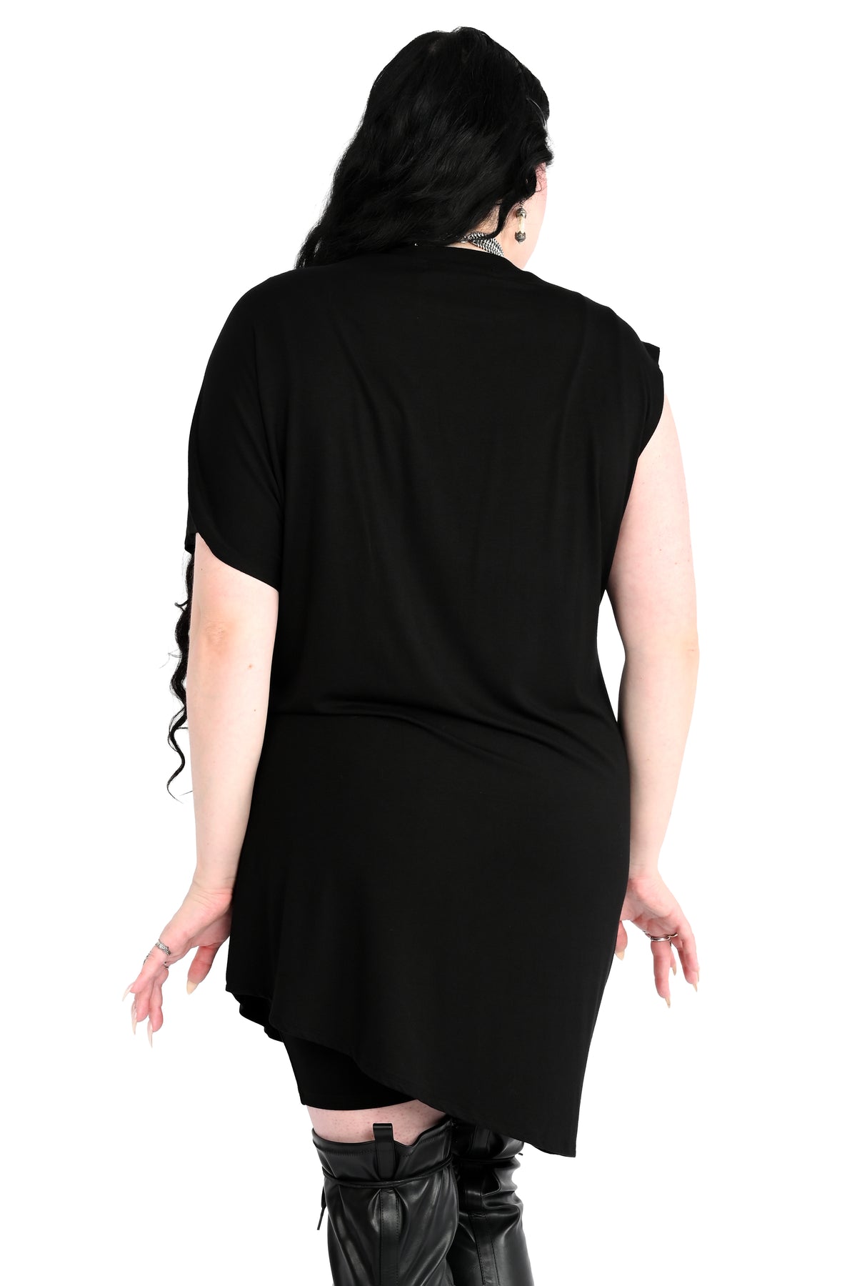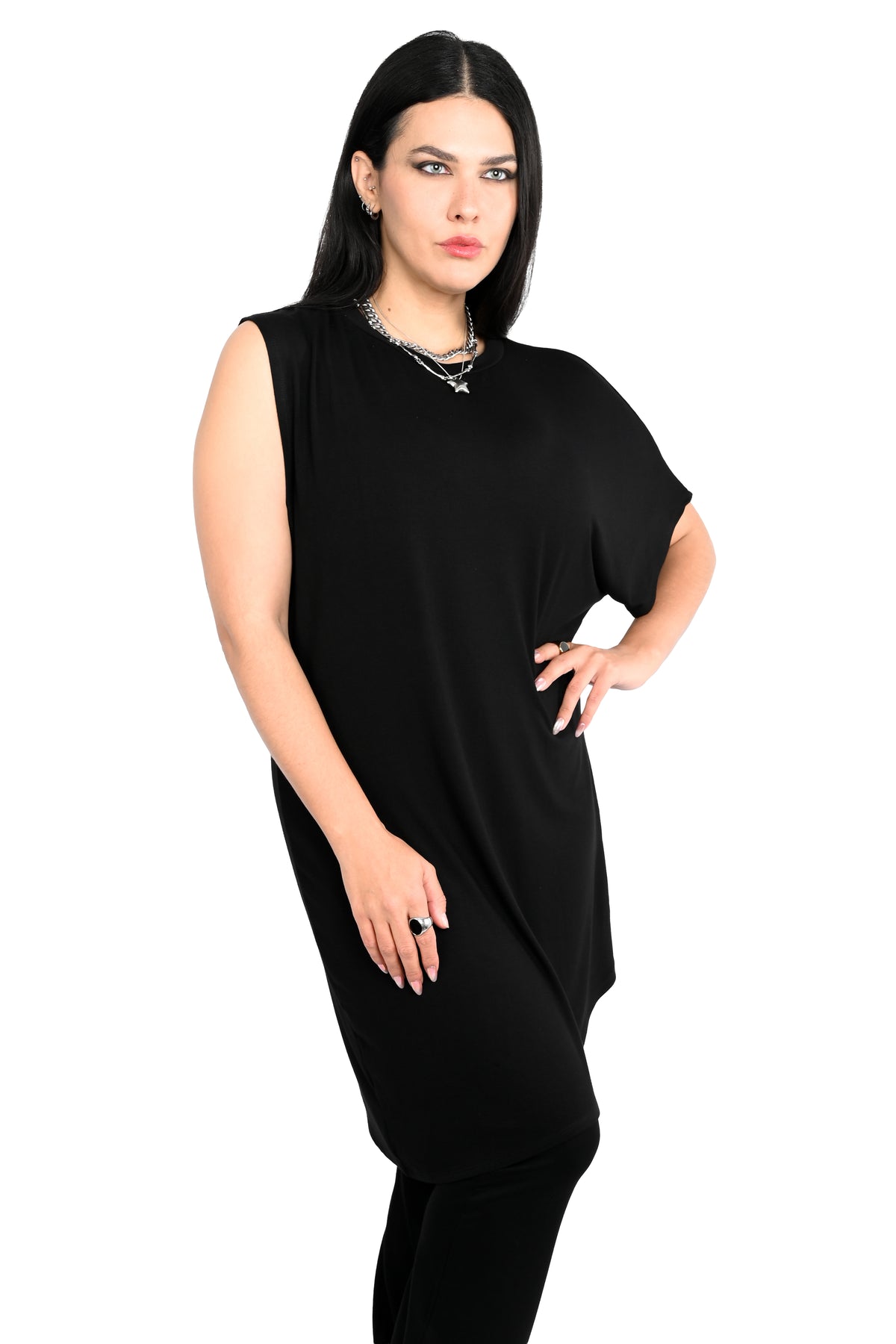 This top is oversized and long. One side is sleeveless and the other has a dolman style sleeve
