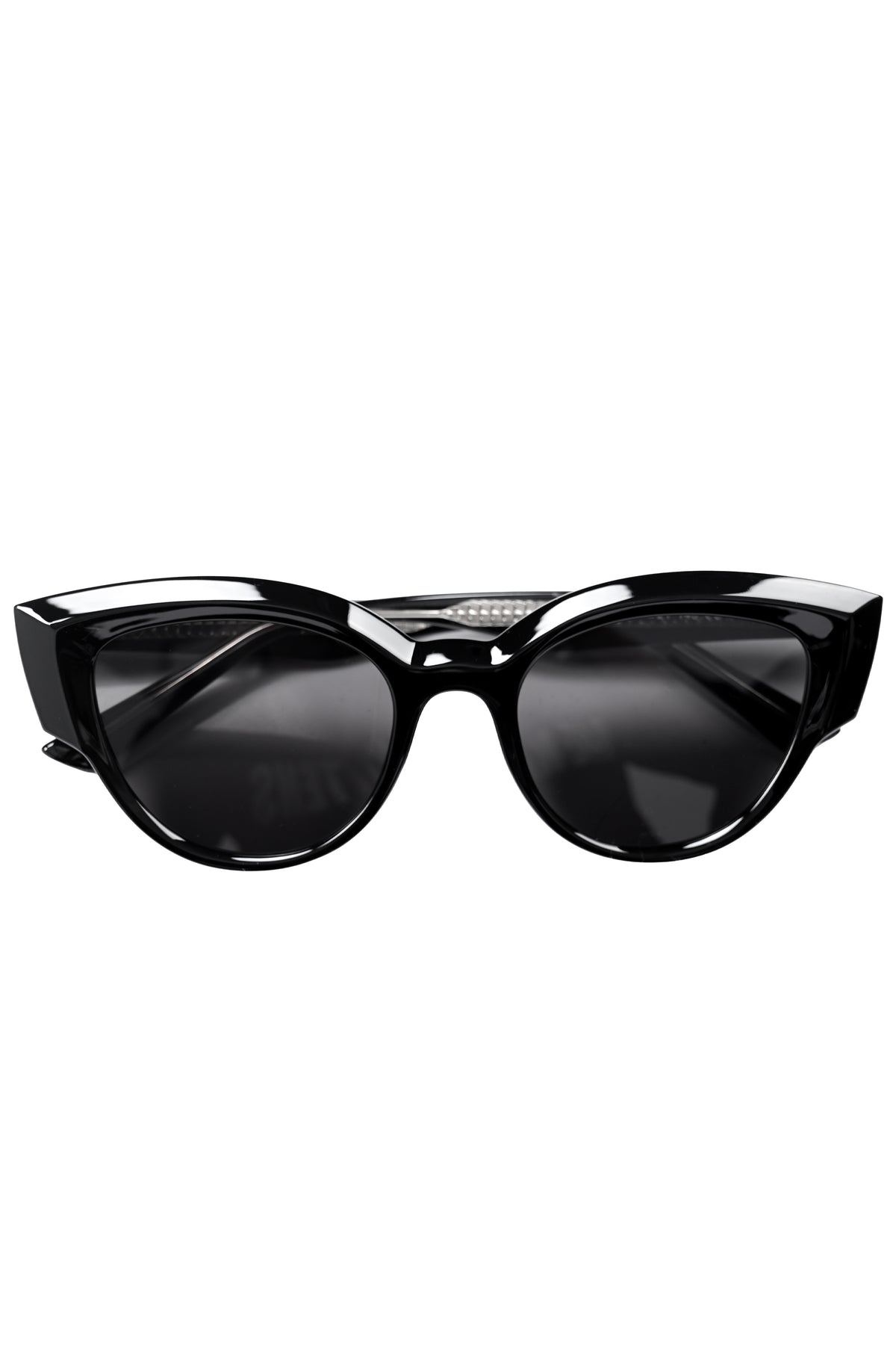 Black cateye sunglasses with black Foxblood logo on the left arm.