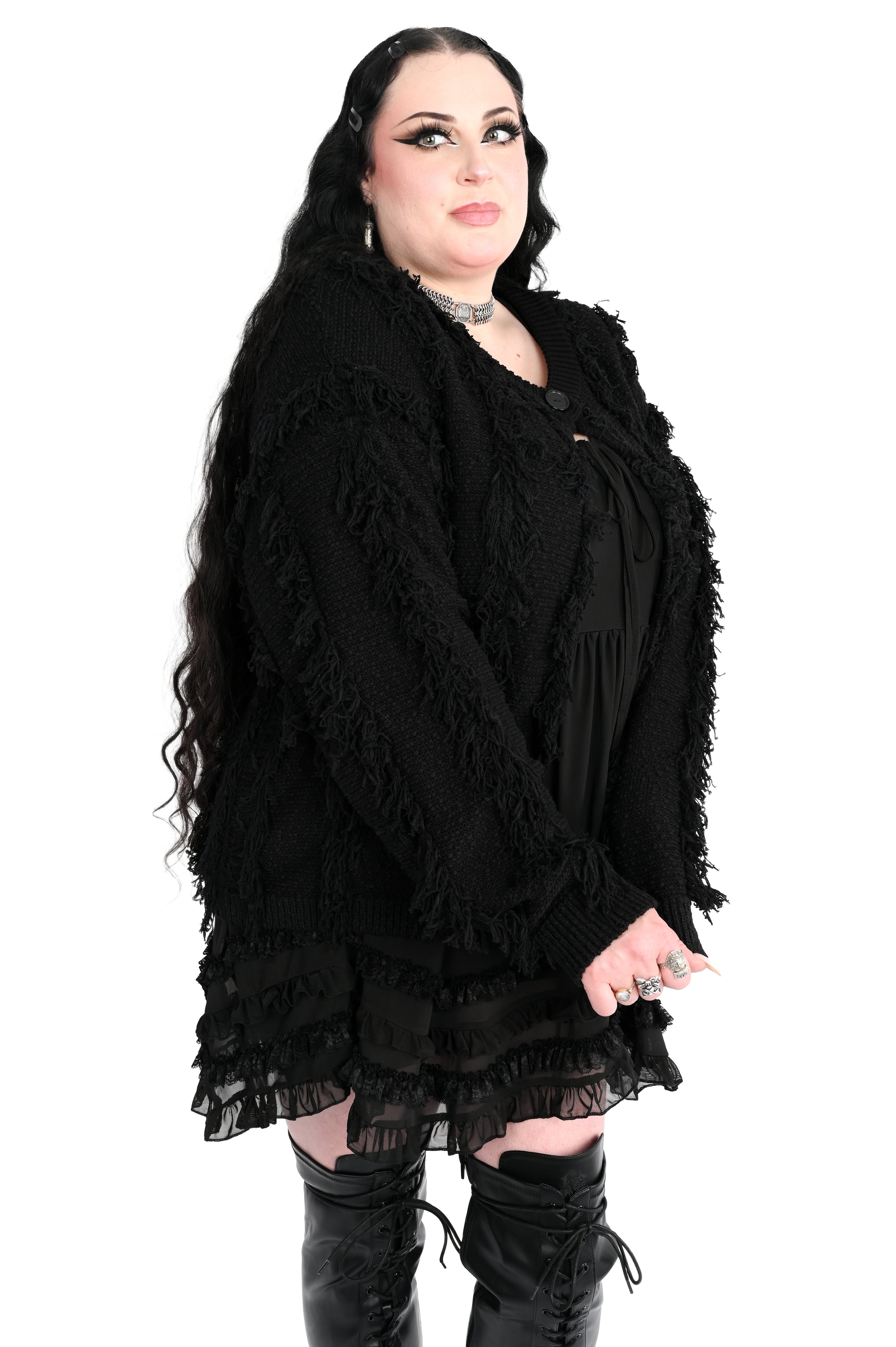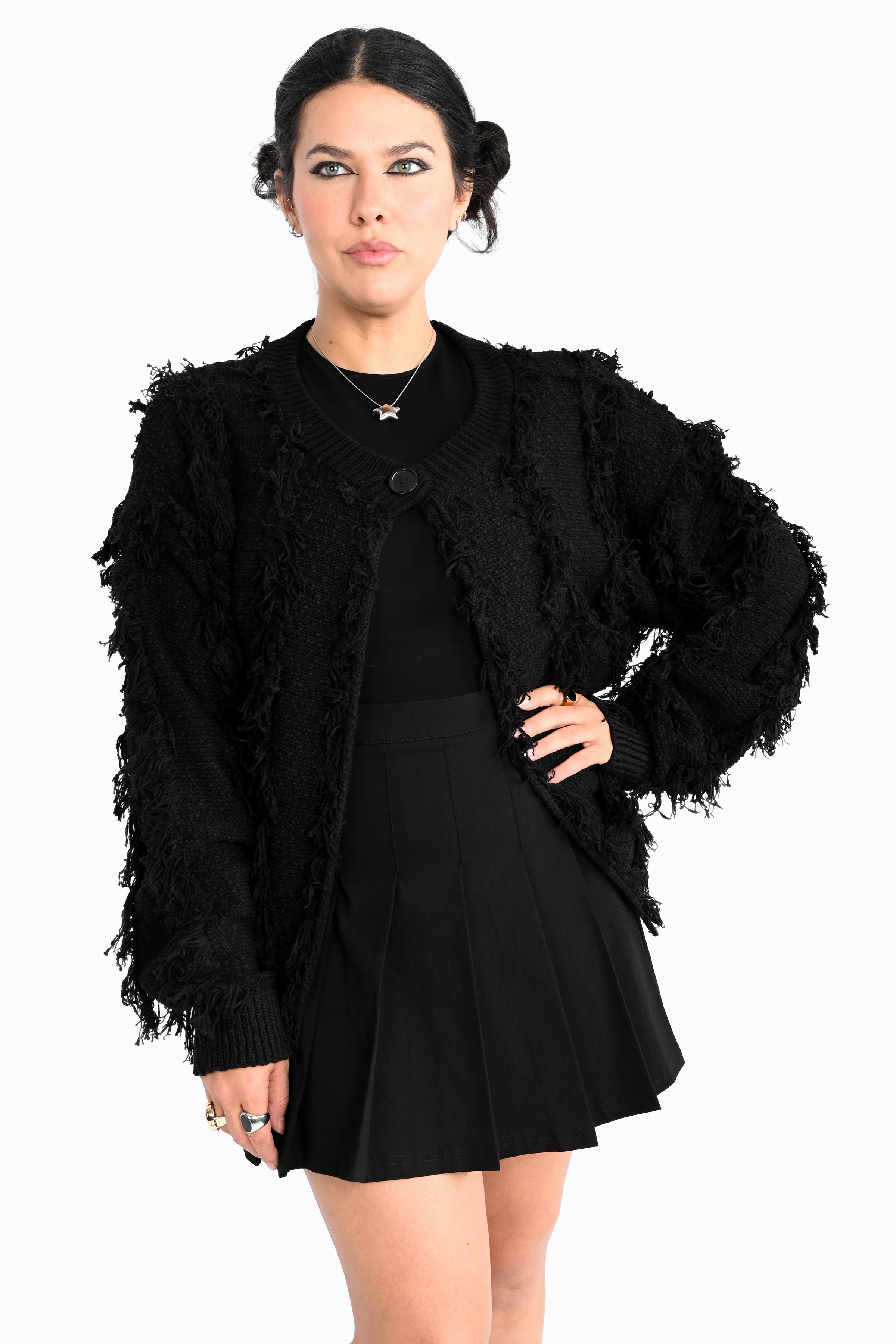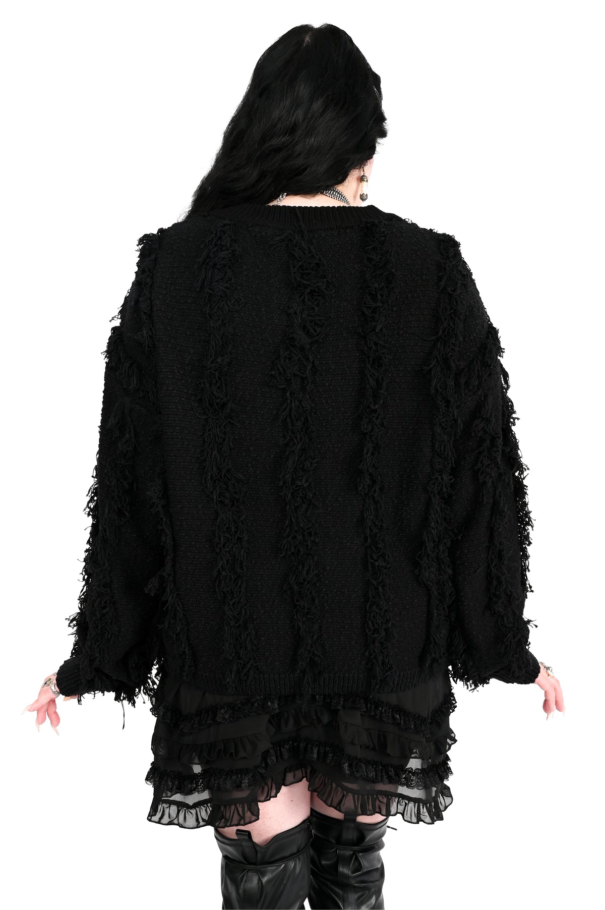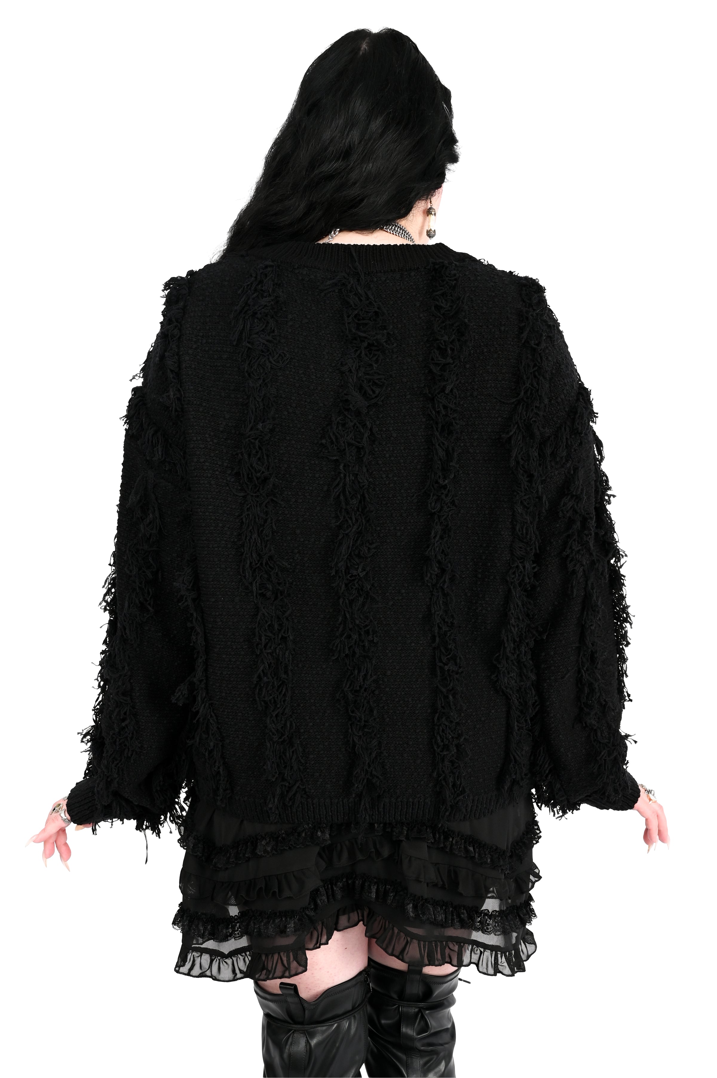 Shaggy cardigan with button up front covered in sweater fringe.