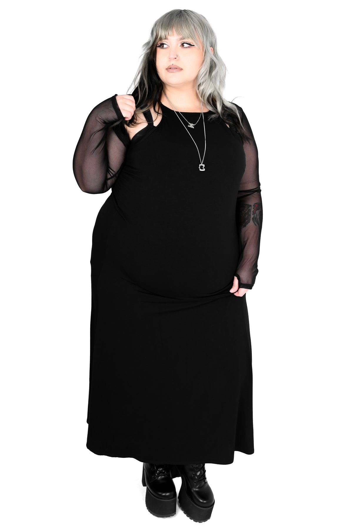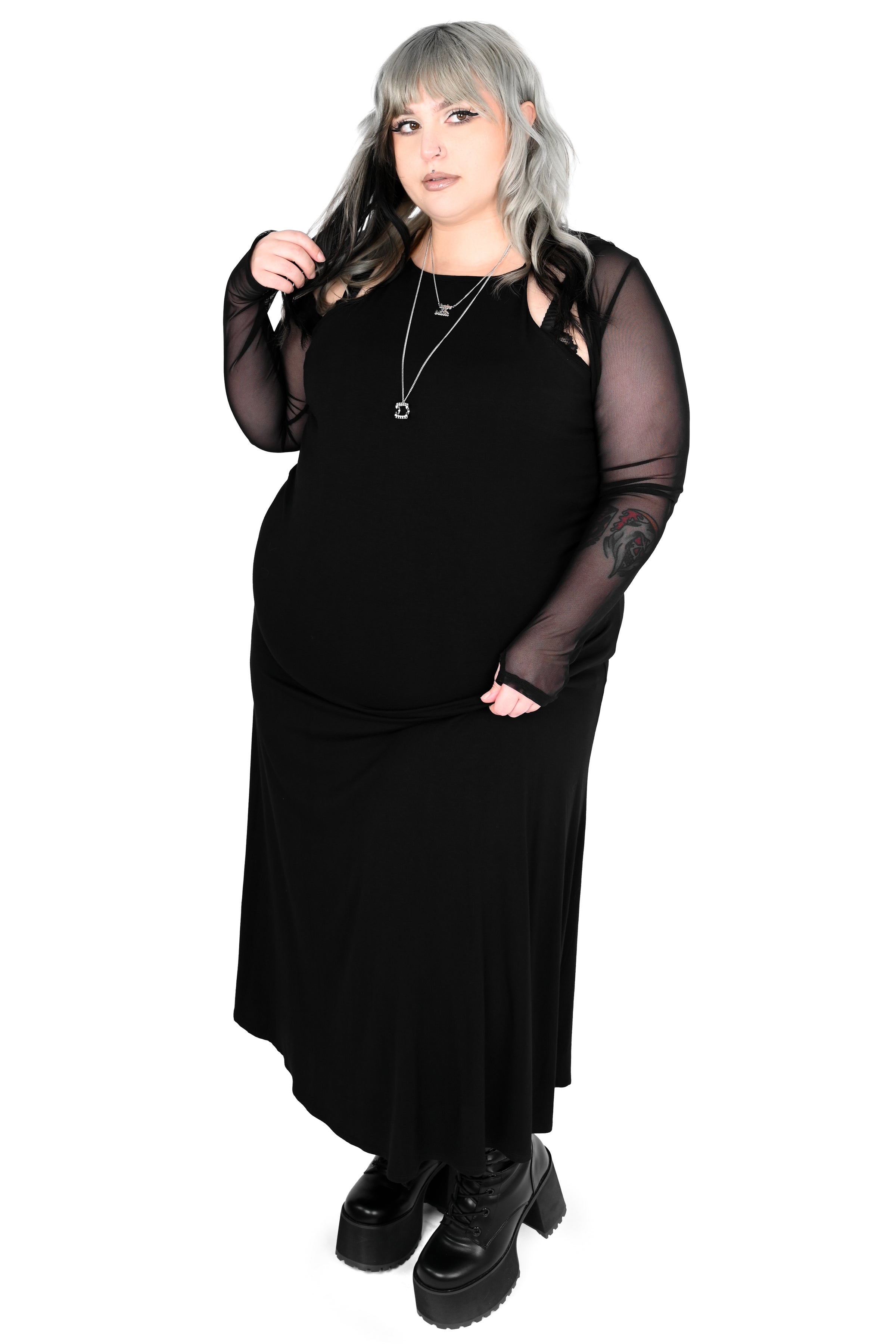 Black maxi length dress with a high mock neckline and comfortable elastic straps.