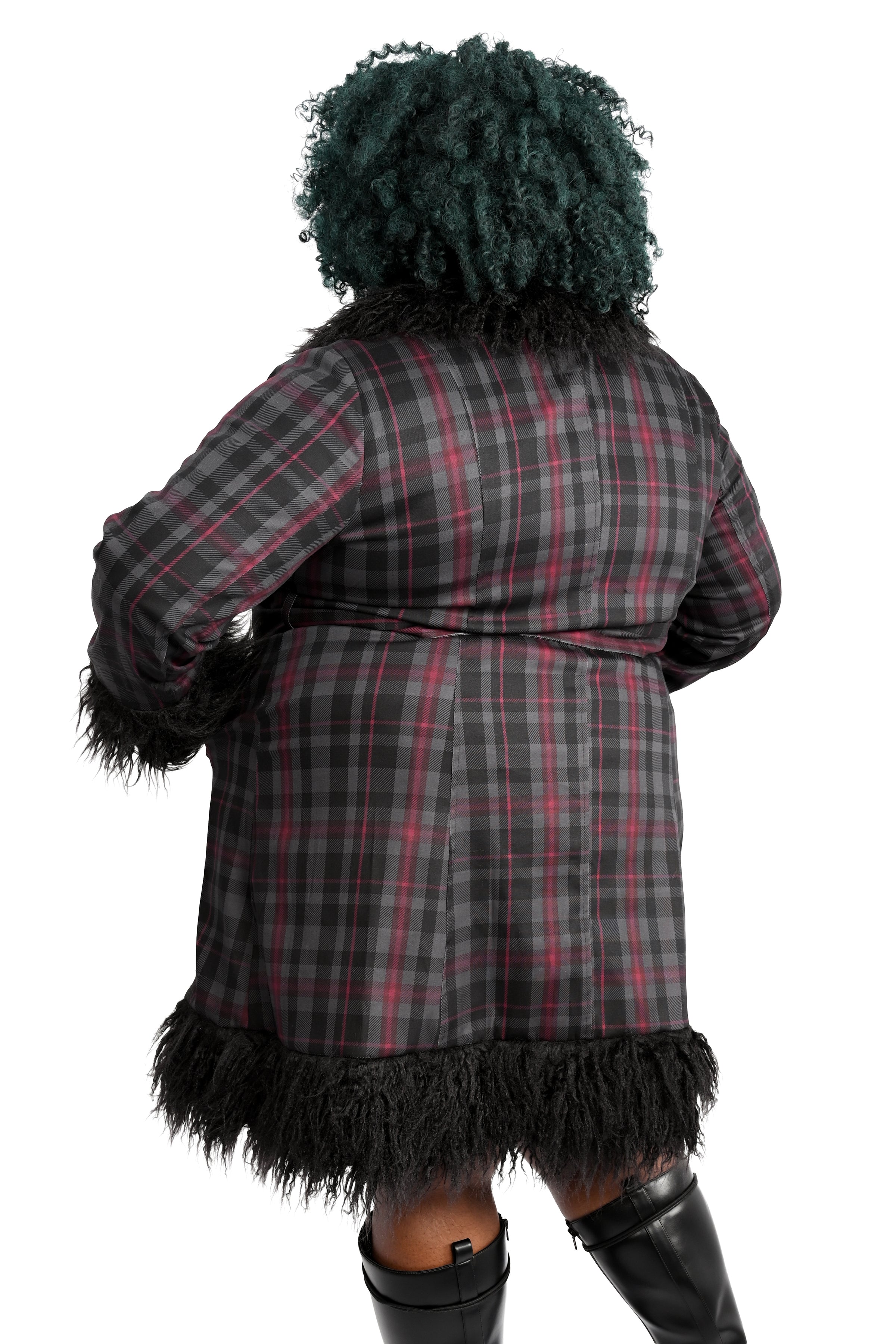 Custom printed plaid twill with the softest black faux fur trim on the collar/lapels and cuffs.