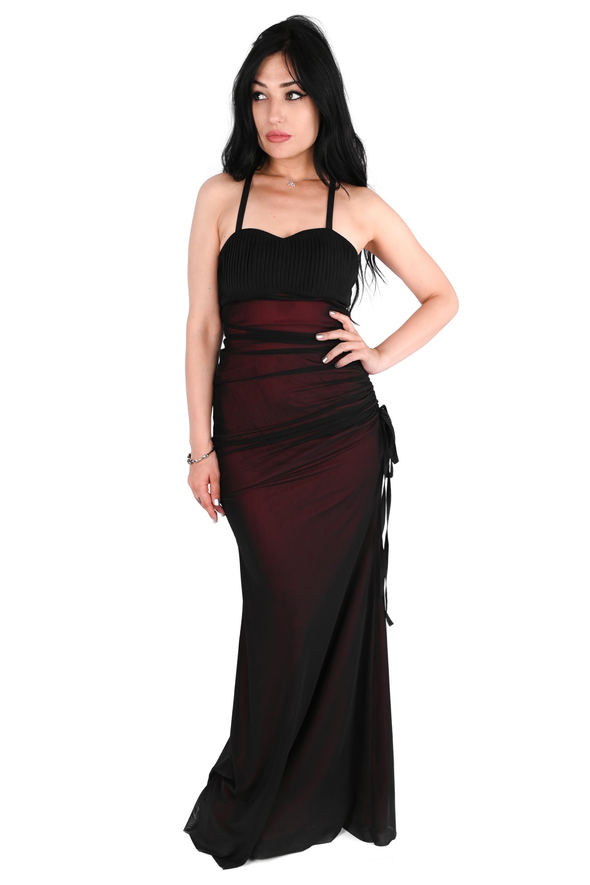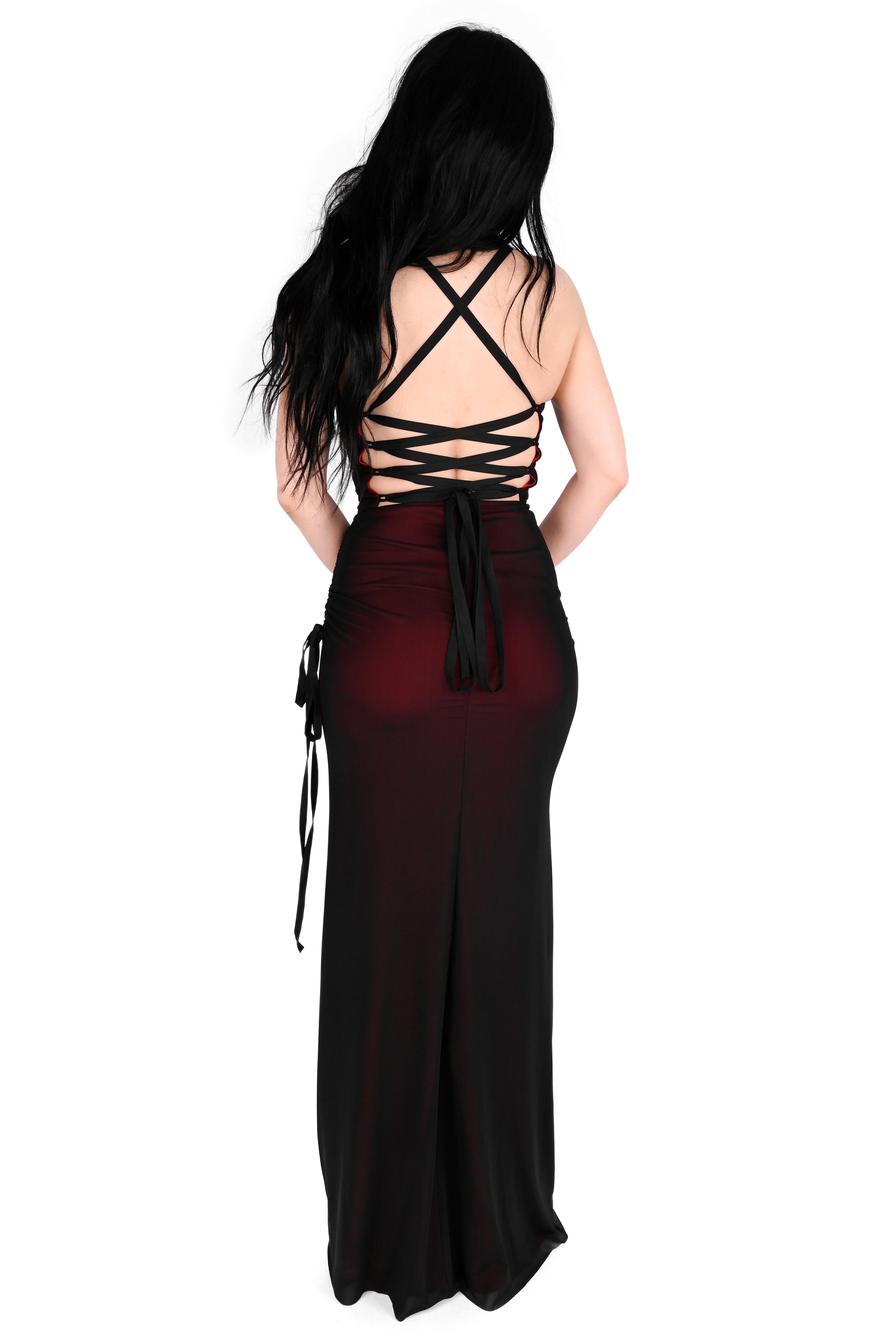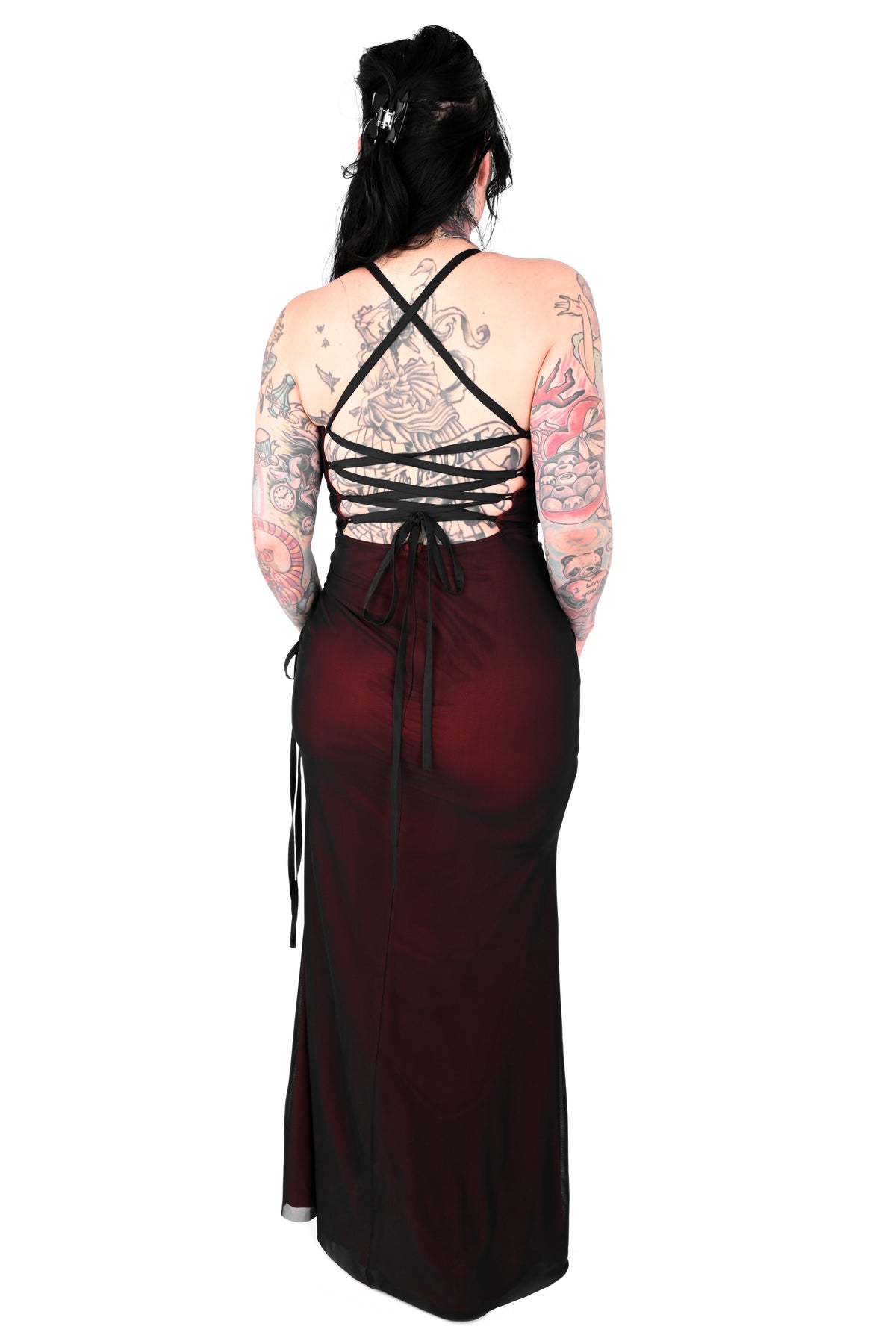 This gown has a layer of red fabric with black mesh on top making this the vampiest piece for your closet.
