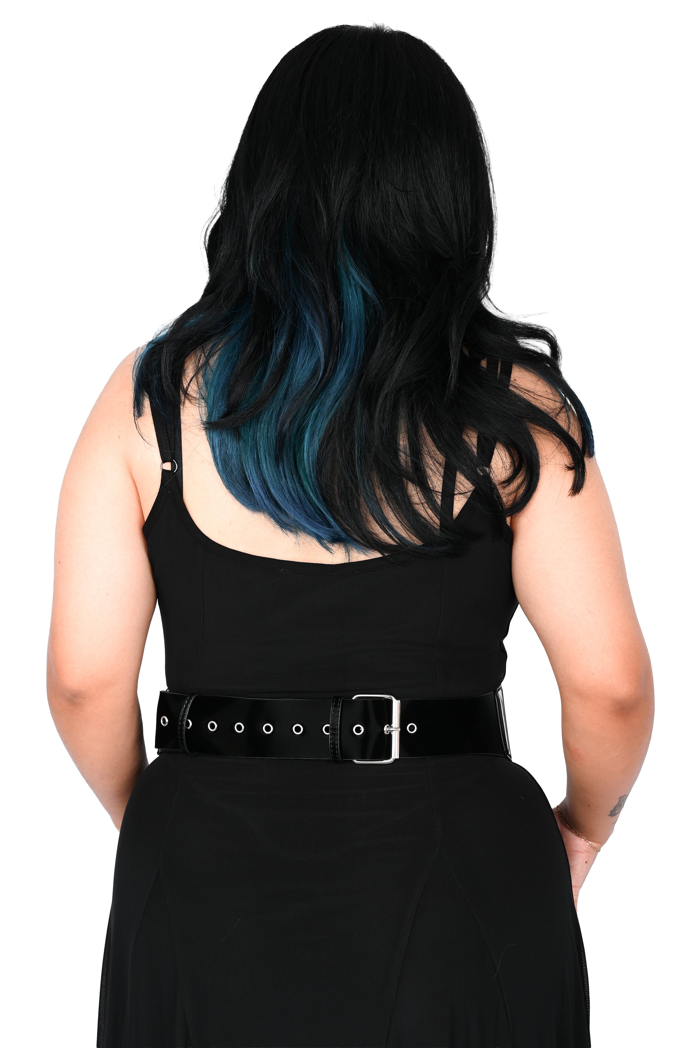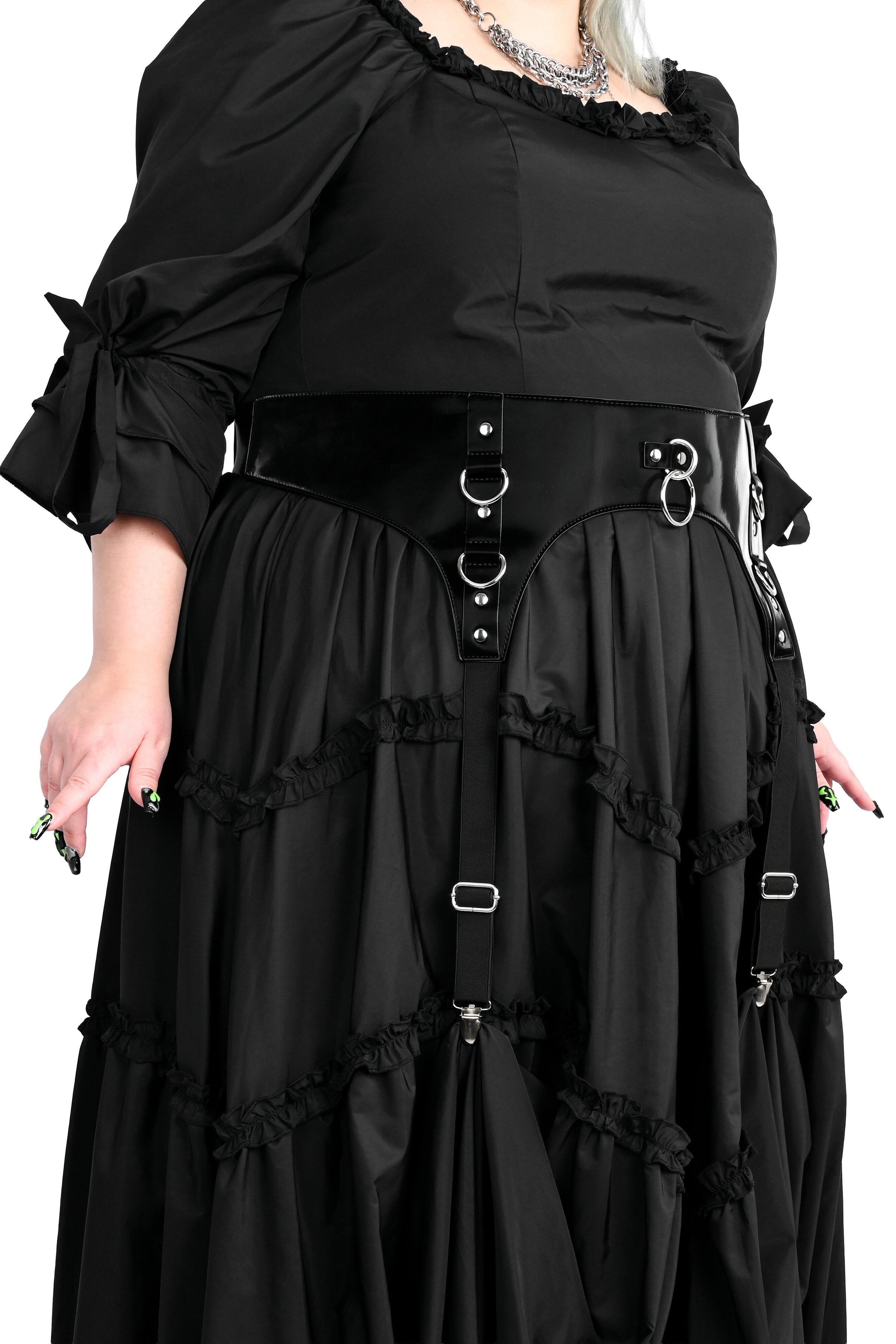 Black liquid velvet belt with o-ring and d-ring details.