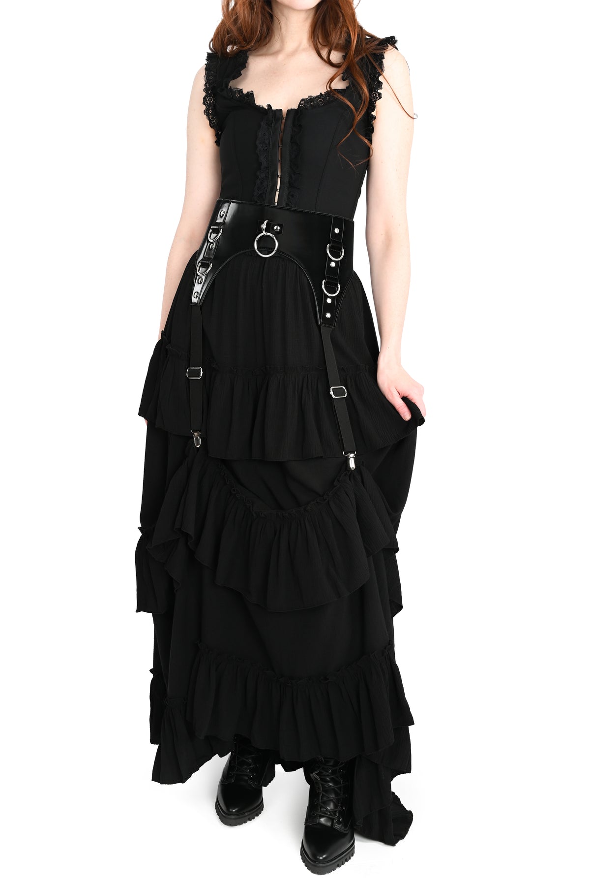 Features functional elastic garter straps that are fully adjustable.
