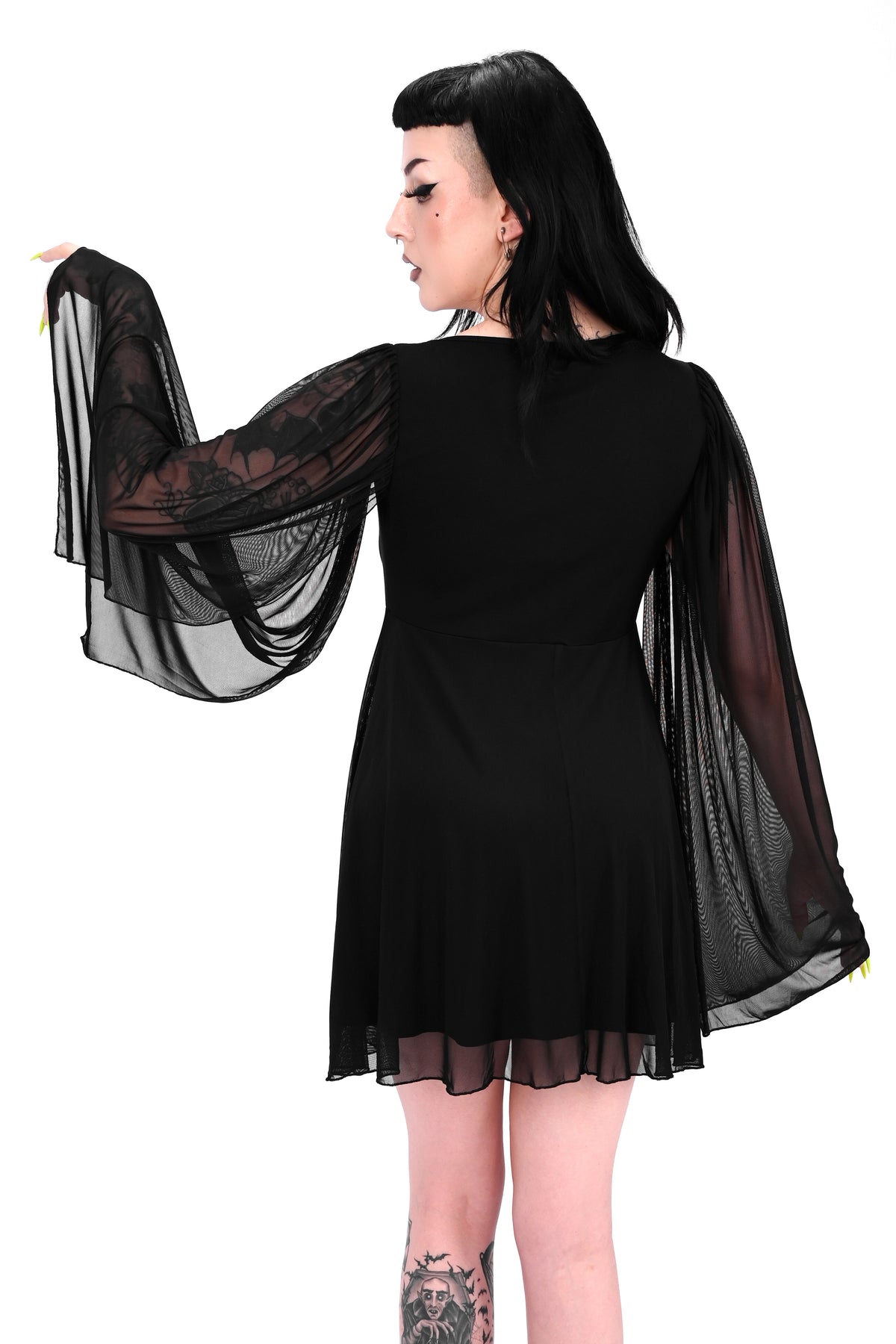 Loose bell sleeves with slits underneath gives this dress a flowy cape silhouette.